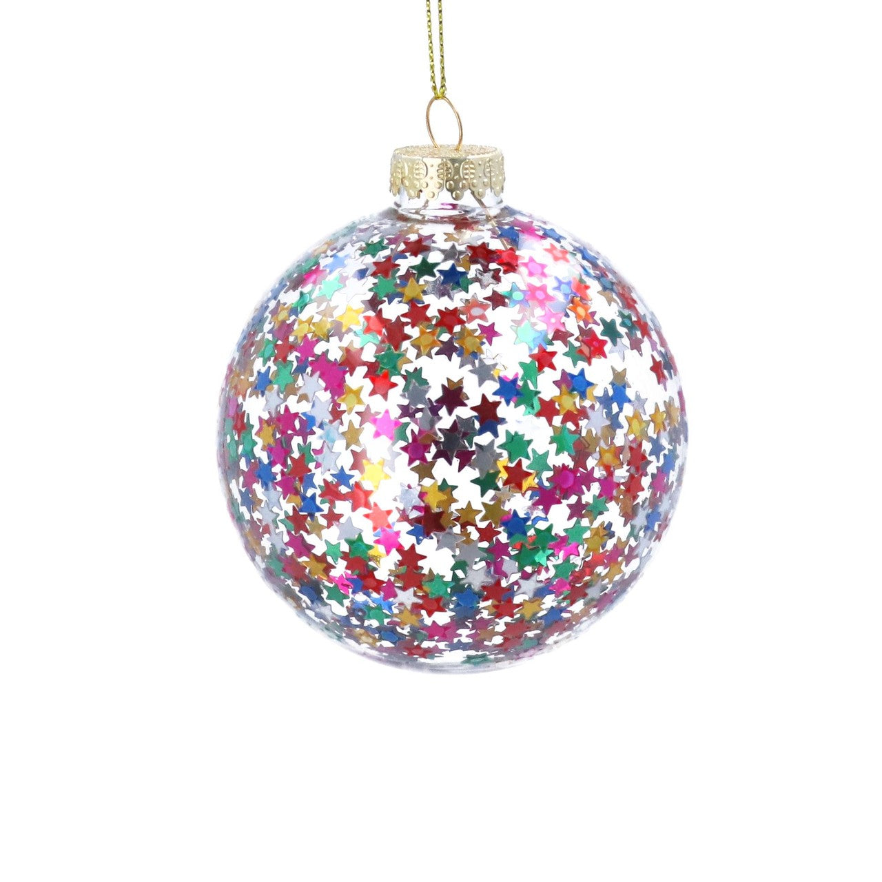 This elegant hanging decoration features a clear glass sphere filled with colourful star-shaped confetti. It offers a subtle yet charming way to enhance your seasonal decor arrangements. The transparency of the glass allows the internal stars to catch and reflect surrounding light beautifully.
