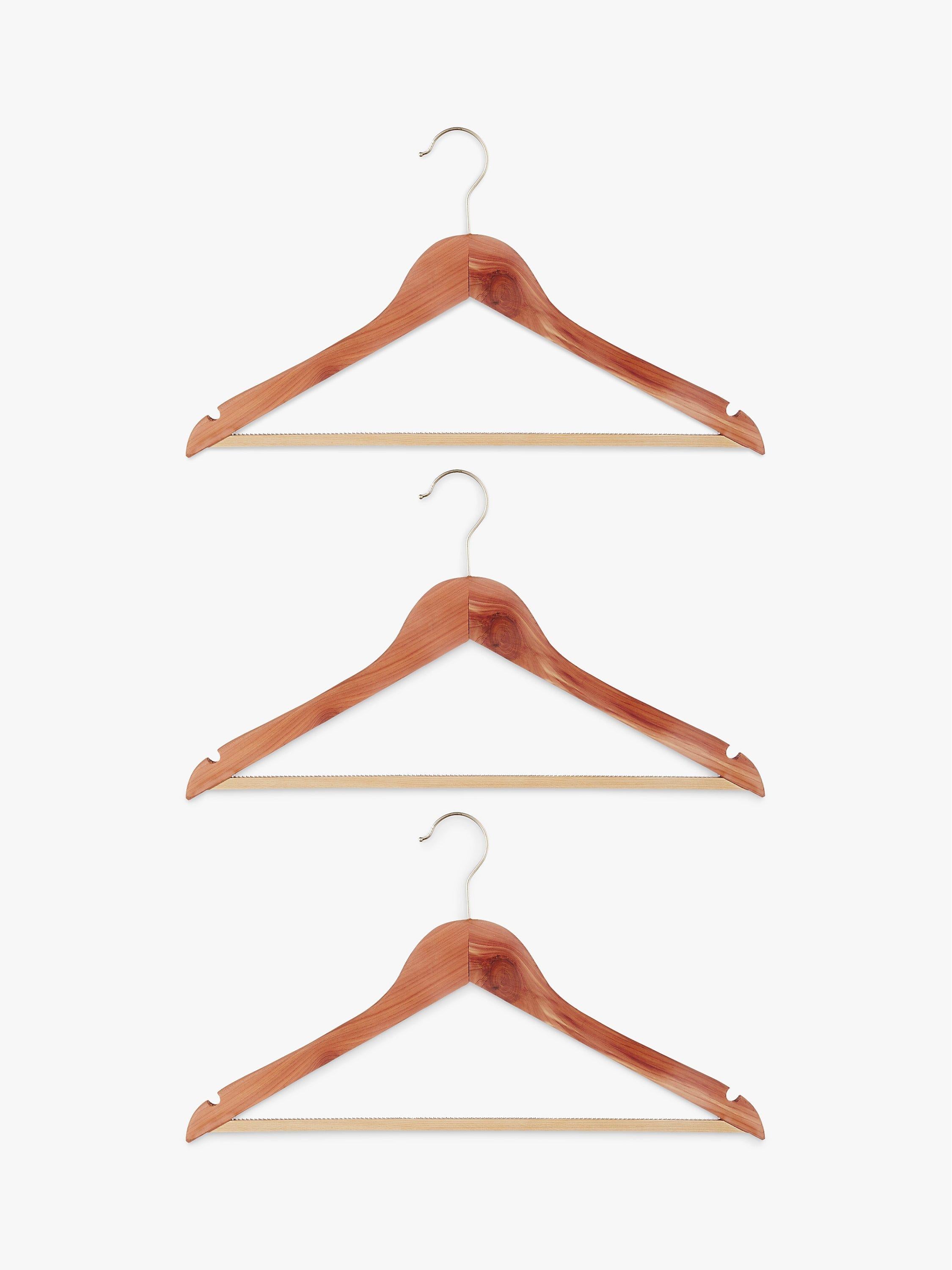 John Lewis offers this FSC-certified pack of three cedar wood clothes hangers for superior garment care. Made entirely from natural, unlacquered timber, these hangers maintain shape exceptionally well. They naturally function as a moth deterrent, providing organic protection for your valued wardrobe items. This quality set is essential for organised clothing storage.