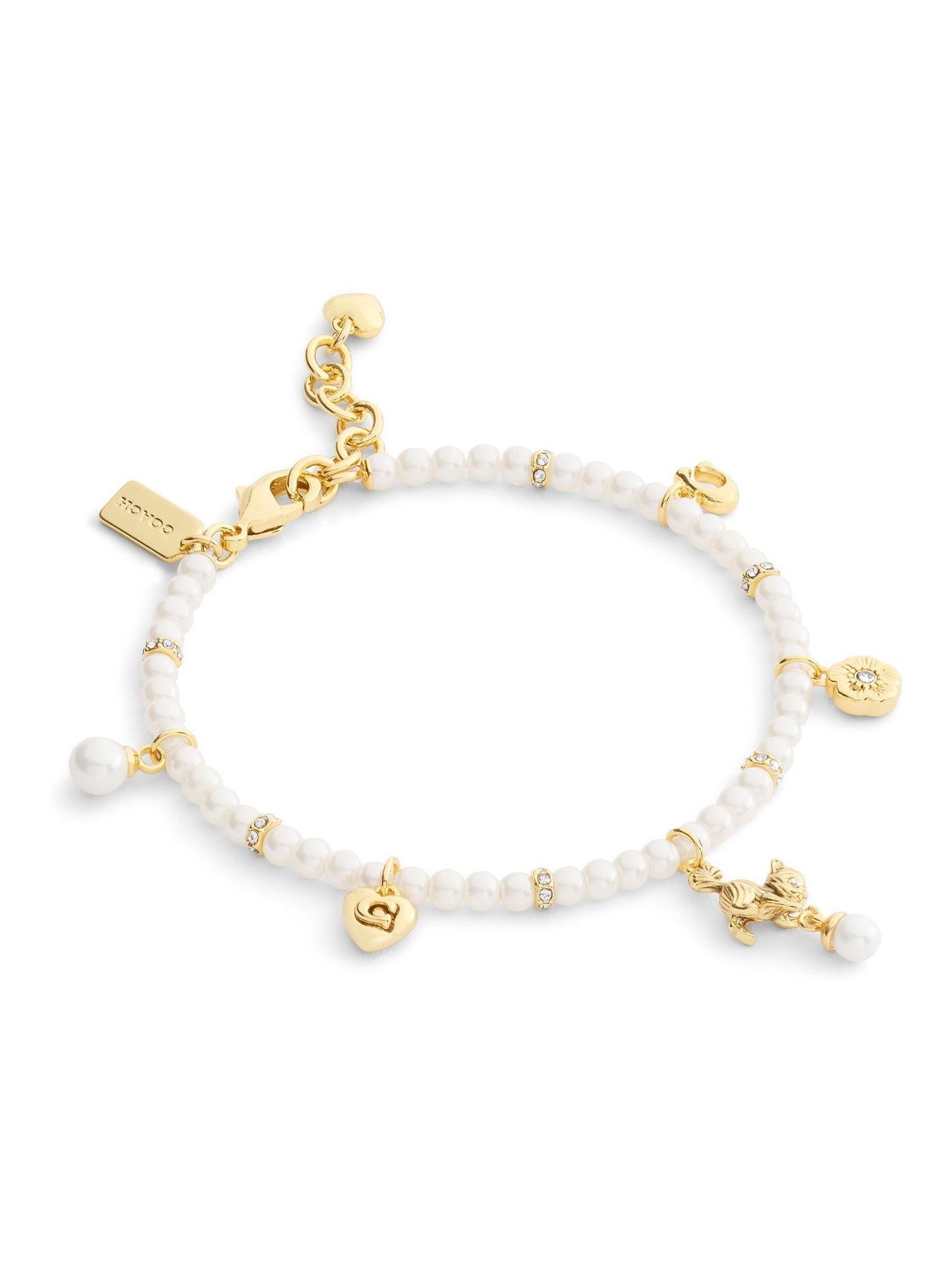 Delicate pearl strand bracelet featuring whimsical mixed charms. Charms include playful cat with pearl, signature sculpted C, timeless tea rose and puffy heart. Necklace has an adjustable lobster clasp closure. Made from brass, glass crystal and imitation pearl. Dimensions - Length: 170mm + 25mm Extender, Width: 3.5mm, Charm Drop: 5-19mm.