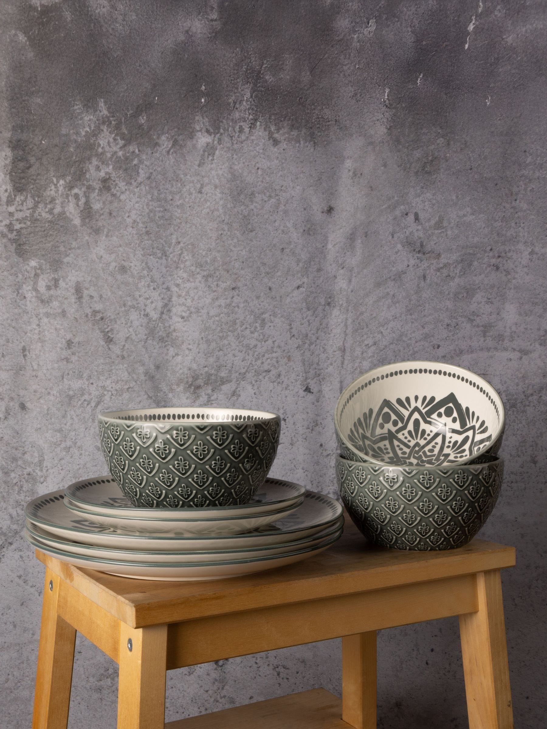 Bring a touch of style to your table with this beautifully patterned 12-piece dinner set, inspired by traditional Moroccan tilework. Featuring intricate designs in a soft sage green, this set of 6x Dinner Plates, 6x Dessert Plates & 6x Bowls will add artisan charm to every meal. Dinner Plate Diameter 26.5 cm Side Plate Diameter 20 cm Bowl Depth 15cm Dishwasher safe, microwaveable Size : ONE.