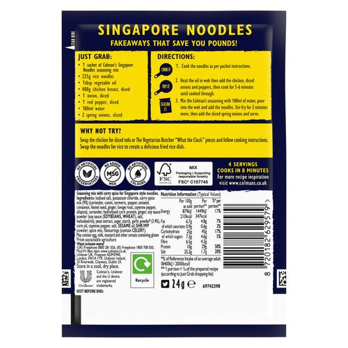 Product Description Enjoy a delicious, fakeaway family meal within minutes with Colman's Weekend Wonders Singapore Noodles Meal Maker. With our carefully selected blend of curry spices, this seasoning mix is free from artificial colours and preservatives. When you've got our Singapore Noodles Meal Maker on hand, all you'll need is... Read More