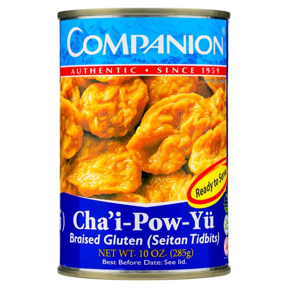 Companion Cha'i Pow Yu, also known as Braised Gluten, is a traditional Chinese dish made from gluten pieces simmered in a flavourful sauce. Gluten, derived from wheat protein, is prepared to achieve a chewy and meat-like texture, absorbing the savoury sauce made from soy sauce, ginger, garlic, and other spices. This dish is popular among vegetarians and those seeking meat alternatives due to its satisfying texture and ability to absorb flavours. Companion Cha'i Pow Yu is enjoyed for its hearty and savoury profile, often served alongside rice or noodles, making it a comforting and nutritious choice in Chinese cuisine.