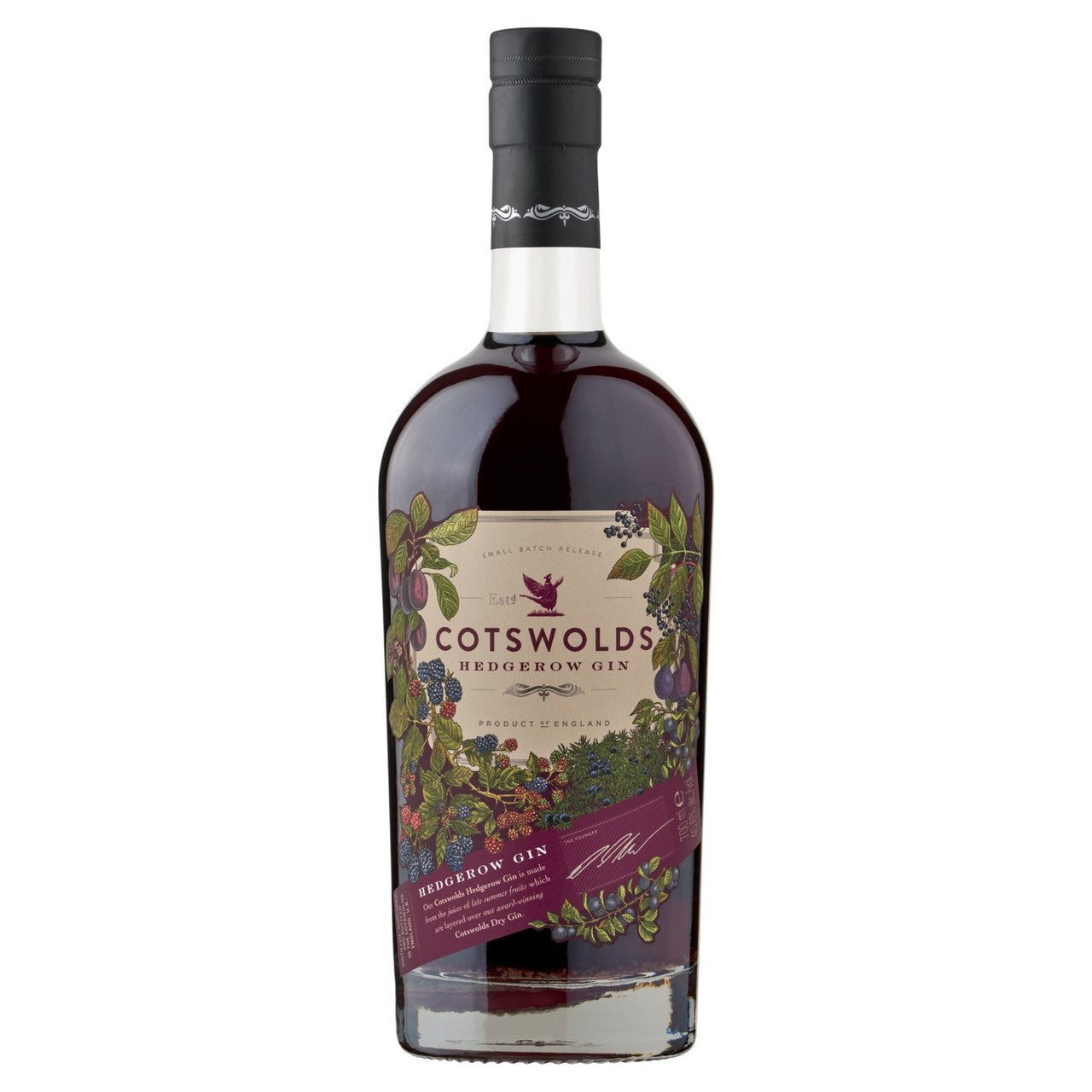 Inspired by the laden hedgerows of the Cotswolds, this Hedgerow Gin blends the distillery's award-winning base spirit with handpicked late summer fruits. It is lightly sweetened, offering a fragrant profile comparable to a fruity sloe gin. The rich flavour comes from carefully sourced local ingredients captured during the harvest season.