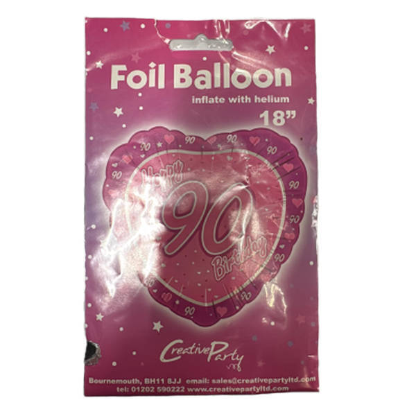 material foil width 18in design heart number text occasion 90th please note can be filled with helium supplied deflated packaging display packet euro hook