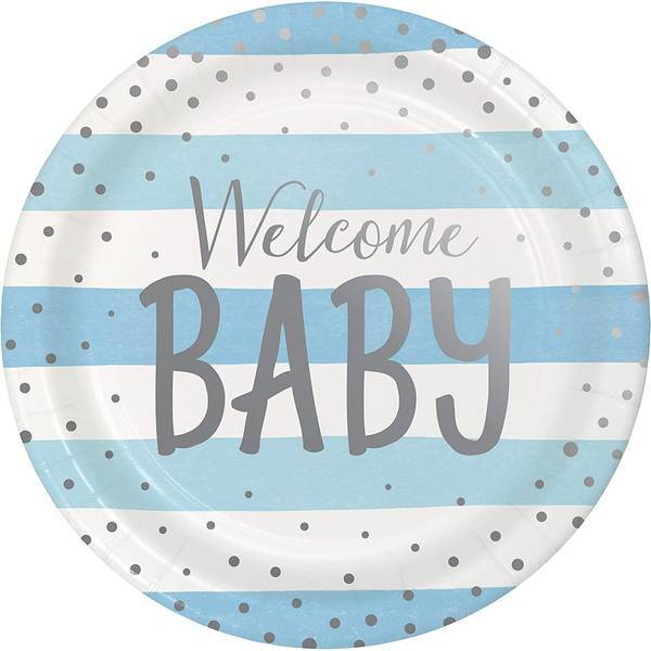 Prepare for your celebration with this pack of eight sturdy paper dinner plates from Creative Party. These plates are designed specifically for welcoming a new baby, ensuring convenient cleanup after the event. They offer a practical yet decorative solution for serving refreshments during your baby shower festivities.