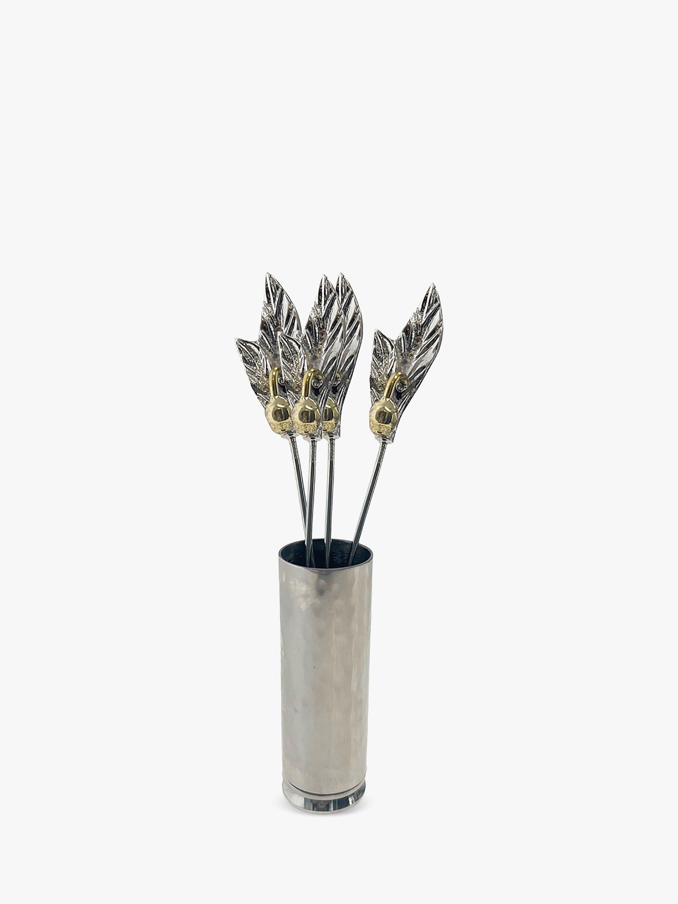 Read MoreIntricately detailed olive picks from Culinary Concepts, finished with a leaf and brass olive design. Made of stainless steel, they're kept together in a matching holder and the set is presented in a gift box.