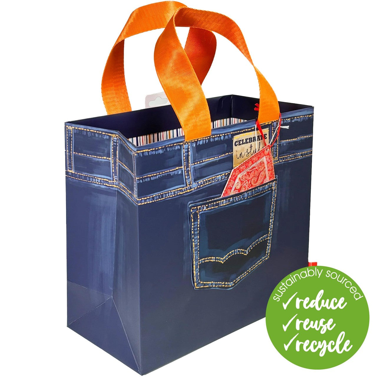 This medium gift bag offers a stylish presentation solution with its durable denim-inspired exterior. It combines aesthetic appeal with practical features suitable for various gifting needs. The construction ensures your present is securely held while maintaining a fashionable look for recipients.
