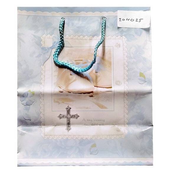 This charming paper bag is designed for presenting small keepsakes and favours at special occasions. Featuring a delicate floral pattern and dedicated handles, it offers a thoughtful way to package your items. The central design, including baby booties and a silver cross accent, makes this ideal for baptisms or baby showers.