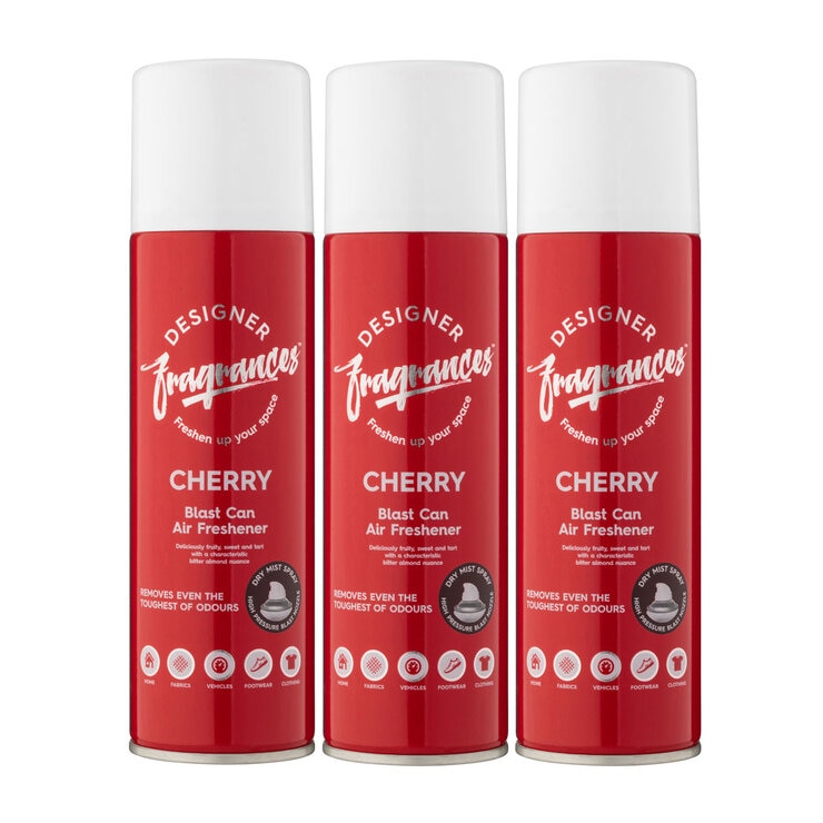 Designer Fragrances Blast Can Air Freshener offers a blast that lasts. It eliminates even the toughest of odours in your home, car, on fabrics or clothing. A single burst freshens the air, leaving a pleasant fresh cherry scent. Inspired by Designer Fragrances, this innovative blast air freshener neutralises odours and lasts for hours. The spray features a high pressure nozzle and actuator system to fragrance large areas quickly with a dry mist spray.