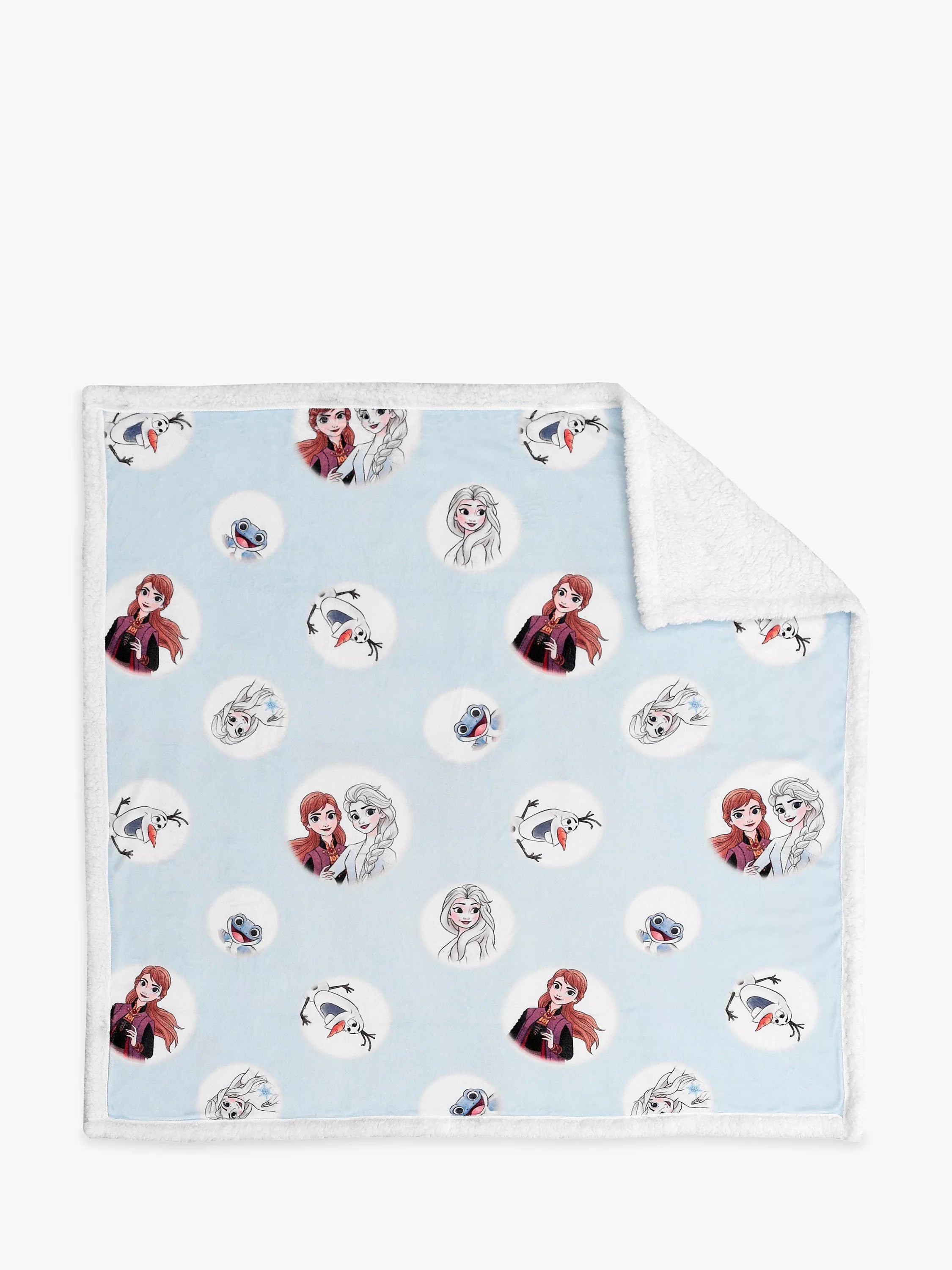 Bring the magic of Frozen to bedtime with this super soft Frozen sherpa fleece throw. Elsa, Anna and Olaf feature in this wintery cameo design, on a soft blue background. The irresistible plush sherpa reverse creates a beautifully soft handle.