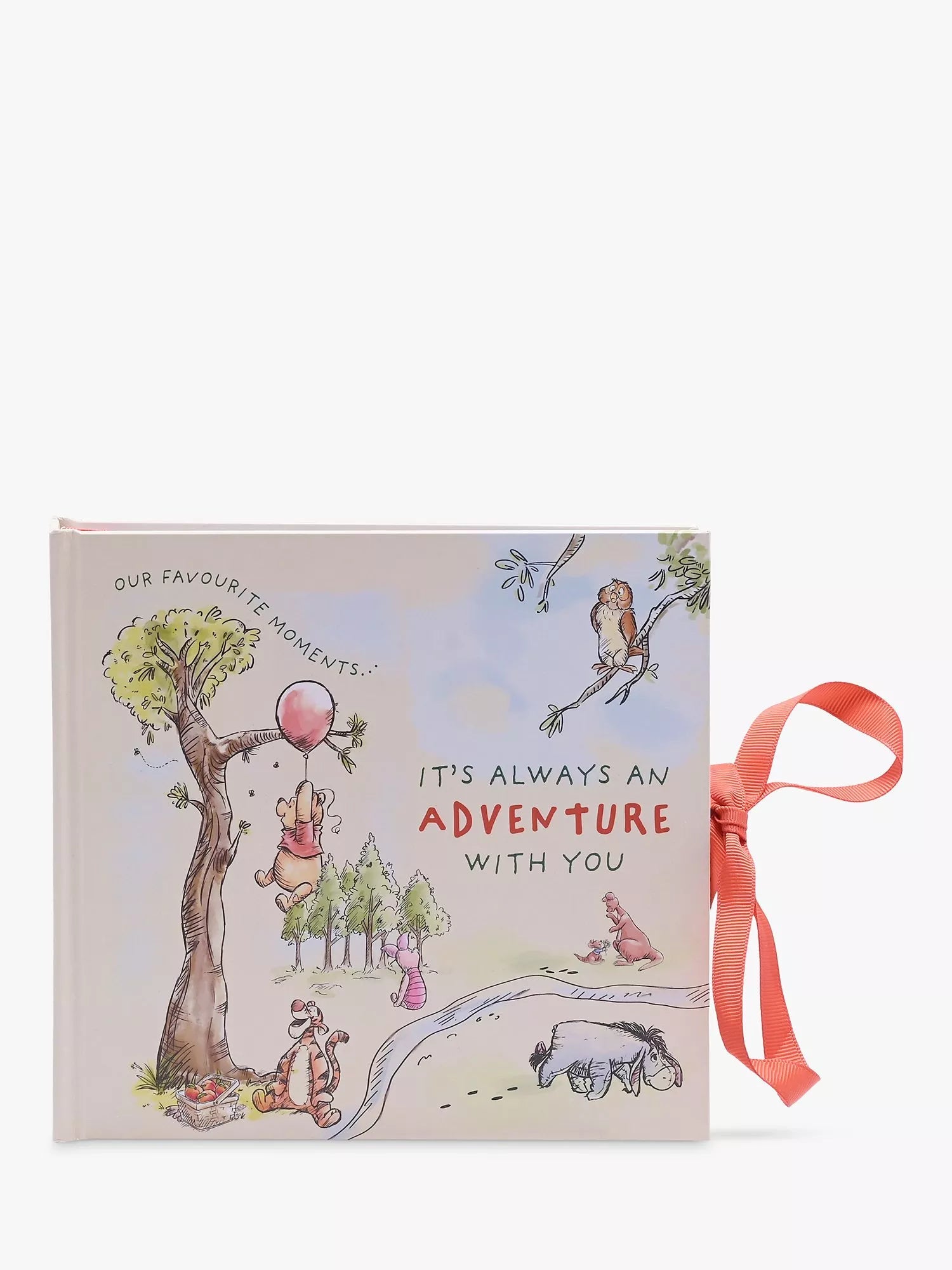 A Winnie the Pooh photo album by Disney. This delightful photo album makes a heart-warming memento of precious moments with new family arrivals. The beige album showcases gorgeous colour illustrations of Winnie the Pooh and friends, complete with 'It's Always an Adventure with You' front cover title and 'My First Photos' wording on the spine. It holds space for photographs, features a completable title page and is finished with red ribbon bow.