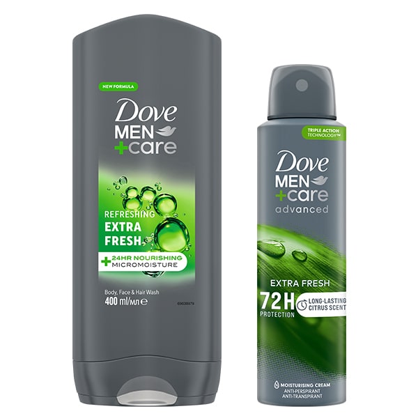 includes dove mencare extra fresh 3in1 hair body face wash 400ml dove men adv antiperspirant deodorant extra fresh 150ml