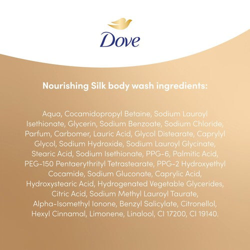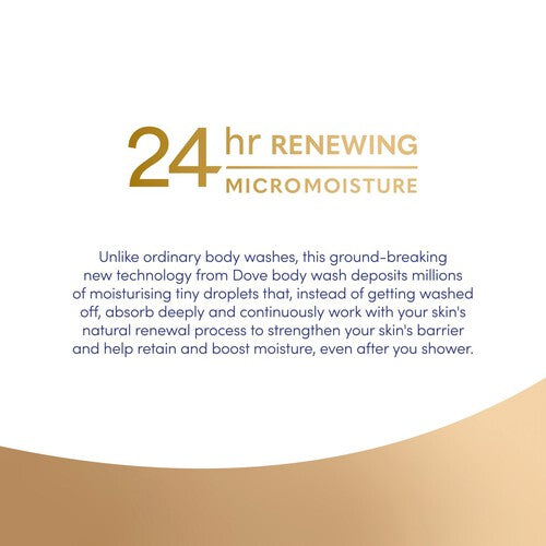Read MoreJust as we all have different skin, skin dryness can show up differently for everyone. From mild, occasionally dry skin driven by ageing or weather fluctuations to dry patches galore – no matter how dry your skin may look or feel, Dove Advanced Care Nourishing Silk Body Wash has got you covered. Specially formulated to transform even the driest skin after just one shower, this gentle body cleanser uses 24-hour renewing MicroMoisture technology to deposit millions of powerfully moisturising droplets onto your skin. Instead of getting washed off, they absorb deeply and work continuously with your skin’s natural renewal process to strengthen its barrier and help retain and boost moisture, even after showering. This moisturising body wash helps you turn every shower into an act of self-care, giving you 24 hours of replenished, silky-soft skin. The 98% bio-degradable* shower gel formula is made with naturally derived cleansers, skin-natural nutrients and 0% sulfate SLES to gently cleanse your skin while nourishing its microbiome. It is also PETA-Approved Vegan and packaged in 100% recycled plastic bottles**.