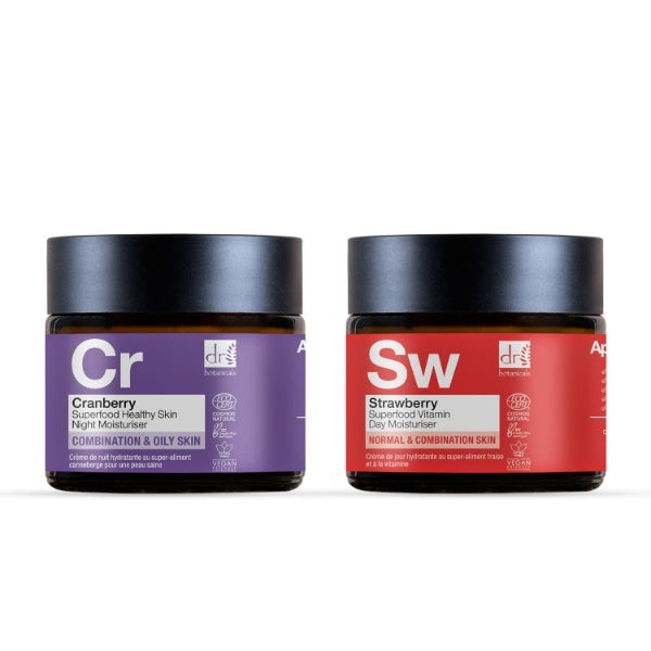 Read MoreThis next-generation vegan skincare kit, from our Apothecary range, combines day and night moisturizers to revitalize and nourish your complexion. Awaken your skin with our refreshing Day Moisturizer. Infused with strawberry and juniper berry superfoods, this formula absorbs quickly, leaving a subtle scent and a radiant glow. Packed with vitamins B6, C, E, and K, it removes excess oil, locks in moisture, and balances your skin for a dewy finish. As night falls, indulge in our Cranberry Night Moisturizer. This powerful formula improves tone and texture while locking in moisture, promoting a soft-to-the-touch finish. Wake up to brighter, firmer skin with reduced pores, revealing a supple and refreshed complexion. Experience the power of natural ingredients and next-generation vegan skincare with this dynamic duo.