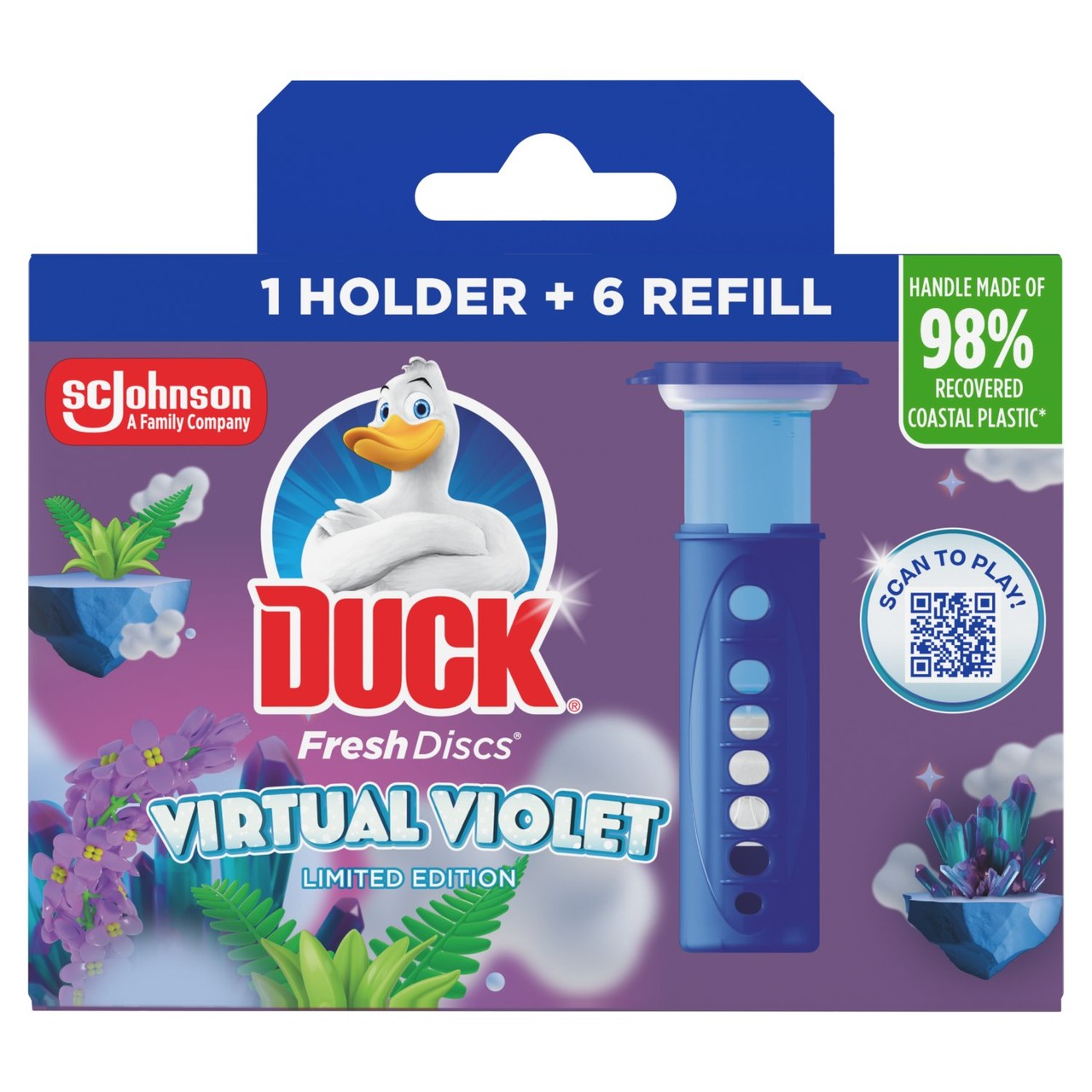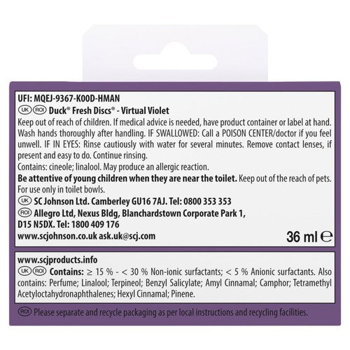 Maintain continuous bowl hygiene with the Duck Fresh Discs Virtual Violet system. This limited edition product combines cleaning power with a pleasant, long-lasting fragrance for your toilet.
