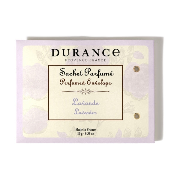 durance perfumed envelope lavender 10g luxury french home fragrance delicately scented sachet handcrafted in provence a calming and aromatic fragrance inspired by provences lavender fields bring the soothing scent of provence into your home with this beautifully perfumed envelope infused with the timeless aroma of lavender this delicate sachet releases a calming and aromatic fragrance that evokes the serenity of lavender fields in full bloom under the warm provenal sun crafted using expert french perfumery techniques it provides a longlasting natural fragrance perfect for creating a peaceful and inviting ambiance fragrance profile top notes fresh lavender herbal accords a crisp and calming opening that invigorates the senses heart notes blooming lavender soft florals a delicate and relaxing floral bouquet base notes musk light woods a warm and comforting finish for a tranquil atmosphere key benefits longlasting soothing fragrance infuses linens clothing and small spaces with a calming floral scent versatile use perfect for wardrobes drawers suitcases cars or anywhere you desire a peaceful and relaxing aroma crafted by expert perfumers developed in collaboration with master perfumers from grasse for an authentic and highquality scent ecofriendly sustainable made with natural fragranceinfused granules and packaged in a recyclable envelope how to use place the perfumed envelope in your wardrobe drawers or luggage shake lightly from time to time to reactivate the fragrance avoid direct contact with fabrics to prevent staining indulge in the calming scent of lavender and let its gentle floral notes bring a sense of relaxation and tranquility to your home