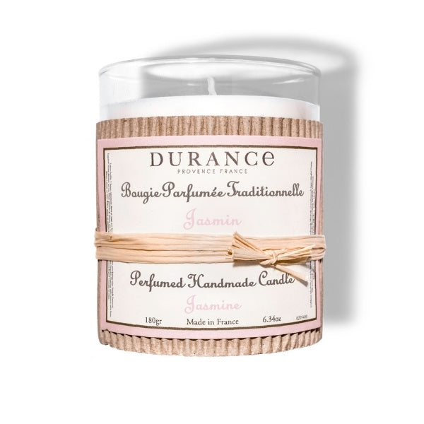 durance perfumed handmade candle jasmine 180g immerse your home in the captivating and opulent scent of jasmine a fragrance that embodies the elegance of this precious flower this luxury handmade candle diffuses a rich floral aroma creating a warm and inviting atmosphere in your space fragrance profile top notes rose spices a fresh and slightly spicy opening heart notes jasmine tuberose ylangylang a lavish floral bouquet base notes musk cedar a soft and woody finish key features natural wax composition crafted with a premium blend of vegetable wax and beeswax for a clean even burn longlasting fragrance provides up to 40 hours of continuous scent crafted in provence handpoured in durances workshops in grignan provence showcasing authentic french artisanal expertise elegant design encased in a refined glass container adorned with a handtied raffia ribbon adding a touch of sophistication to your dcor usage tips trim the wick to 05 cm before each lighting to ensure a steady flame and prevent soot allow the wax to melt evenly across the surface during each use to prevent tunneling place on a heatresistant surface away from drafts and flammable materials for optimal fragrance diffusion and safety experience the timeless elegance of jasmine let the rich floral notes of jasmine complemented by hints of rose and spices create a serene and inviting atmosphere bringing the timeless beauty of this exquisite flower into your home