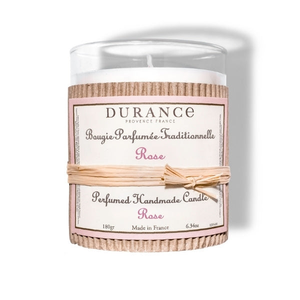 durance perfumed handmade candle rose 180g immerse your home in the timeless and sophisticated scent of rose ptale a fragrance that captures the essence of the centifolia rose in full bloom this luxury handmade candle diffuses a fresh floral aroma creating an elegant and inviting atmosphere in your space fragrance profile top notes rosebuds spicy accord a fresh and subtly spicy opening heart notes camomile rose petals geranium a harmonious blend of floral nuances base notes rose leaves cedar a soft and woody finish key features natural wax composition crafted with a premium blend of vegetable wax and beeswax for a clean even burn longlasting fragrance provides up to 40 hours of continuous scent crafted in provence handpoured in durances workshops in grignan provence showcasing authentic french artisanal expertise elegant design encased in a refined glass container adorned with a handtied raffia ribbon adding a touch of sophistication to your dcor usage tips trim the wick to 05 cm before each lighting to ensure a steady flame and prevent soot allow the wax to melt evenly across the surface during each use to prevent tunneling place on a heatresistant surface away from drafts and flammable materials for optimal fragrance diffusion and safety experience the timeless elegance of rose ptale let the refined floral notes of centifolia rose complemented by hints of camomile and cedar create a serene and inviting atmosphere bringing the classic beauty of blooming roses into your home
