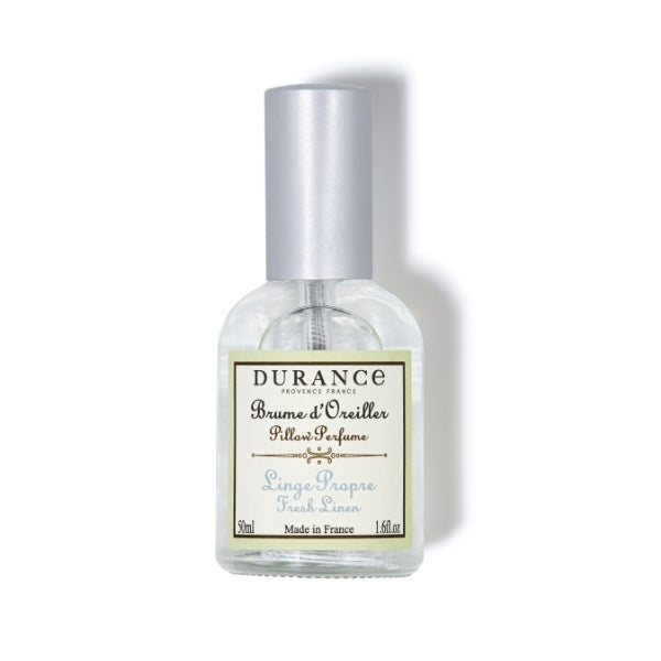 durance pillow perfume fresh linen 50ml luxury french home fragrance clean refreshing handcrafted in provence a crisp and invigorating fragrance with the essence of fresh linen infuse your pillows and linens with the refreshing and comforting scent of fresh linen this luxurious pillow perfume crafted in provence using the finest ingredients and expert french perfumery techniques evokes the clean crisp fragrance of freshly laundered sheets with just a few spritzes you can transform your sleeping space into a serene and inviting haven perfect for relaxation and a restful nights sleep fragrance profile top notes fresh aldehydes soft citrus a clean and uplifting opening that evokes freshly washed linens heart notes cotton flower white musk a delicate floral heart with a soft powdery texture base notes light woods powdery notes a warm and comforting finish for a balanced serene ambiance key benefits promotes relaxation the crisp fresh scent of linen helps create a calming environment promoting a restful sleep delicate longlasting fragrance infuses your pillow linens and bedding with a fresh clean aroma that lasts crafted by expert perfumers developed in collaboration with master perfumers from grasse for an authentic highquality fragrance versatile use ideal for pillows sheets bedding or any soft surface where you desire a refreshing clean scent ecofriendly sustainable packaged in a recyclable bottle for minimal environmental impact how to use lightly spritz the perfume onto your pillow linens or bedding before sleep allow a few moments for the fragrance to settle and absorb before resting reapply as needed to maintain a fresh and clean aroma indulge in the fresh and invigorating scent of fresh linen and let its clean uplifting notes bring a serene and peaceful atmosphere to your sleeping space