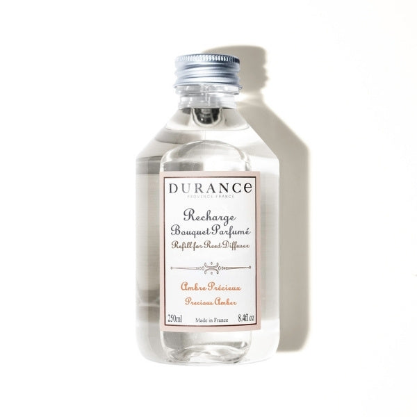 Durance Refill for Reed Diffuser Precious Amber 250ml Luxury French Home Fragrance Refill – Handcrafted in Provence Sustain a Warm and Enveloping Ambiance with the Rich Scent of Precious Amber Replenish your reed diffuser with the luxurious fragrance of Precious Amber, a scent that envelops your interior with deep and warm amber notes, enhanced by oriental facets revealing a trail of vanilla and cedar for an incredible escape. This 250ml refill allows you to maintain a warm and enveloping atmosphere in your home. Fragrance Profile Top Notes: Amber, Lemon Heart Notes: Cistus Labdanum, Lavender, Rose Base Notes: Patchouli, Vanilla, Cedar Key Benefits Extended Enjoyment: This 250ml refill allows you to recharge your Durance reed diffuser more than twice, providing approximately two months of continuous diffusion. Sustainable Choice: Refilling your diffuser is an eco-friendly option, reducing waste and enabling you to continue enjoying your favourite scent without the need for a new diffuser set. Consistent Fragrance: Ensures a steady diffusion of scent, keeping your home continuously enveloped in the rich aroma of Precious Amber. How to Use Carefully pour the refill liquid into your empty Durance reed diffuser bottle. Insert new natural rattan sticks into the bottle containing the fragrance. Allow the sticks to absorb the scent and naturally diffuse it into the room. For a more intense fragrance, occasionally flip the sticks to refresh the scent diffusion. Crafted in collaboration with master perfumers from Grasse, this Precious Amber fragrance refill allows you to continue transforming your interior into a warm and inviting haven, enveloping your space with the deep and luxurious aromas of Provence.