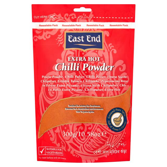 East End presents ground pure spice offering intense heat. This extra hot chilli powder delivers full aroma and flavour profile suitable for vegetarian diets. The spice is sourced globally and processed using modern technology for purity.