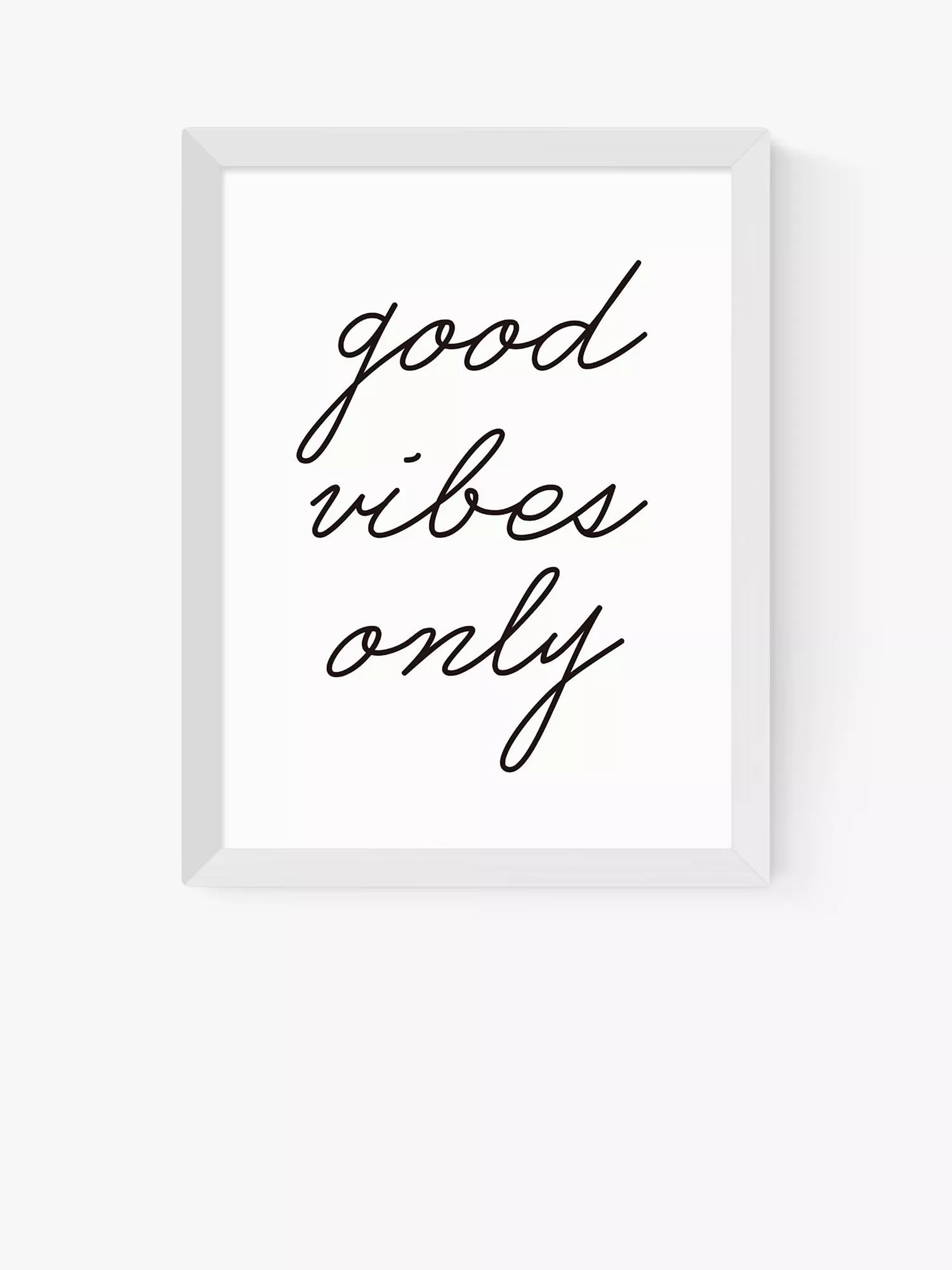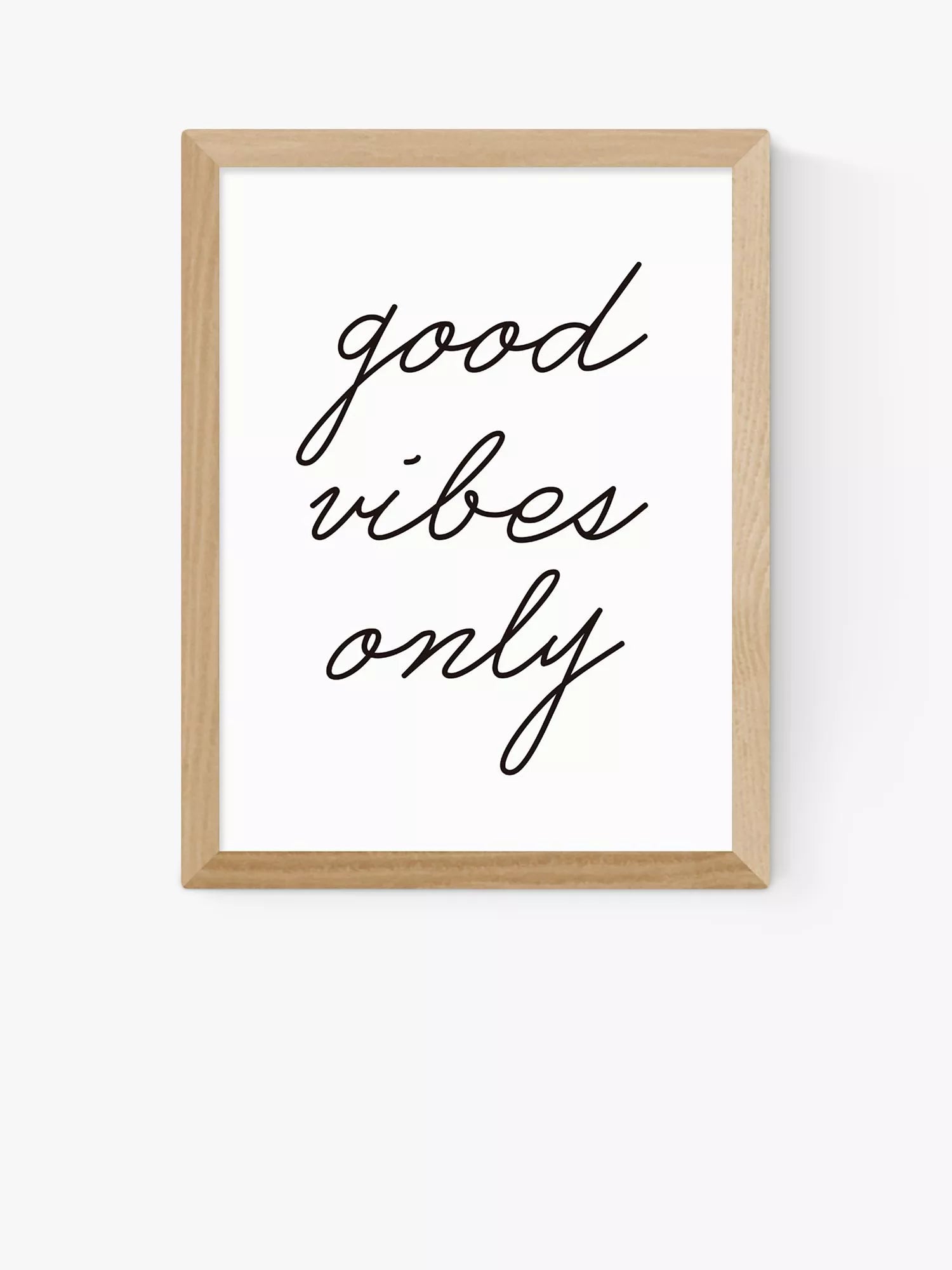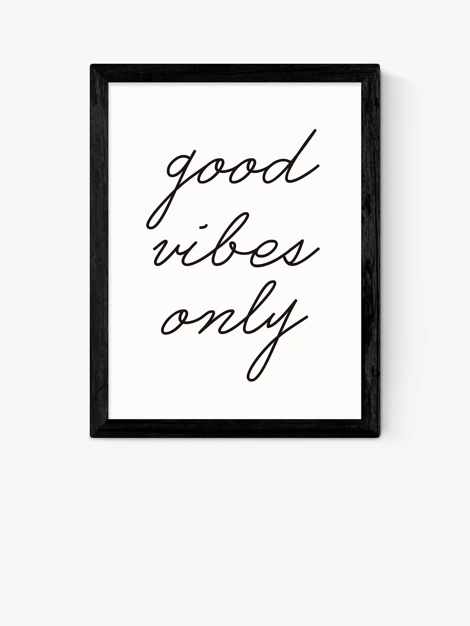 A monochrome typographic feel-good framed print, 'Good Vibes Only' by Rafael Farias.