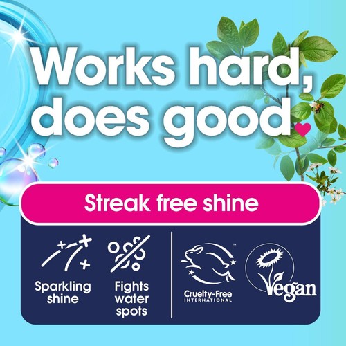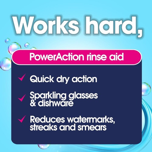 Read More| Power Action Rinse Aid Quick dry action Sparkling glasses & dishware Reduces watermarks, streaks and smears |