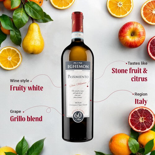 This Eghemon Passimiento Bianco presents a complex, curated blend dominated by Sicily's native Grillo and Catarratto white grapes. A portion of this fruit is partially dried, which lends a distinct richness to this authentic Sicilian white wine. Depth and body are further integrated through three months spent maturing on the lees before bottling.