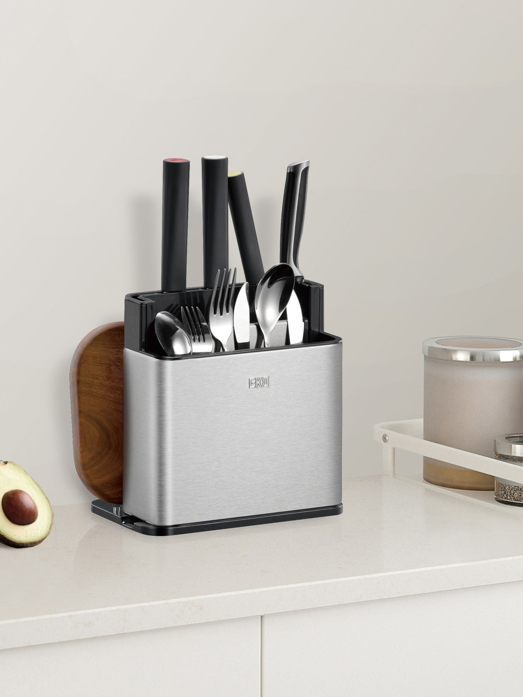 Versatile and stylish kitchen counter organiser. Neatly store and help drain your utensils, gadgets, cutlery, chopping boards & more. In brushed stainless steel with fingerprint resistant coating; Adjustable dividers to customise the compartments to your needs; Easy to disassemble for cleaning; Draining slot to help remove excess moisture. Read More