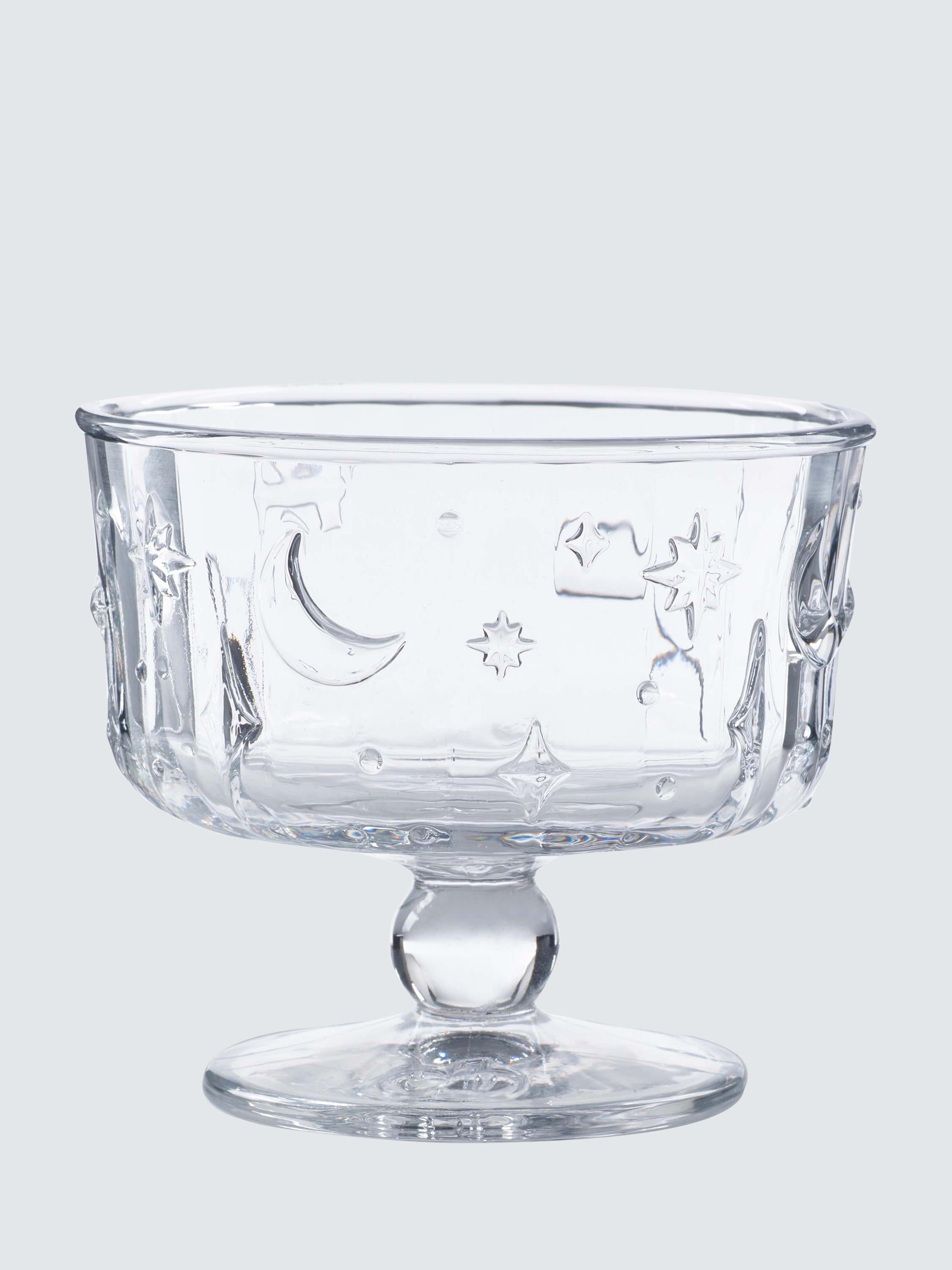 Eleanor Bowmer offers this set of four clear pressed glass dessert bowls, each measuring 11.5cm in diameter for individual servings. These elegant pieces showcase icons from the signature Electric Coast collection, including lips, moons, and stars. The decorative glassware is beautifully presented, making it an ideal gift choice.