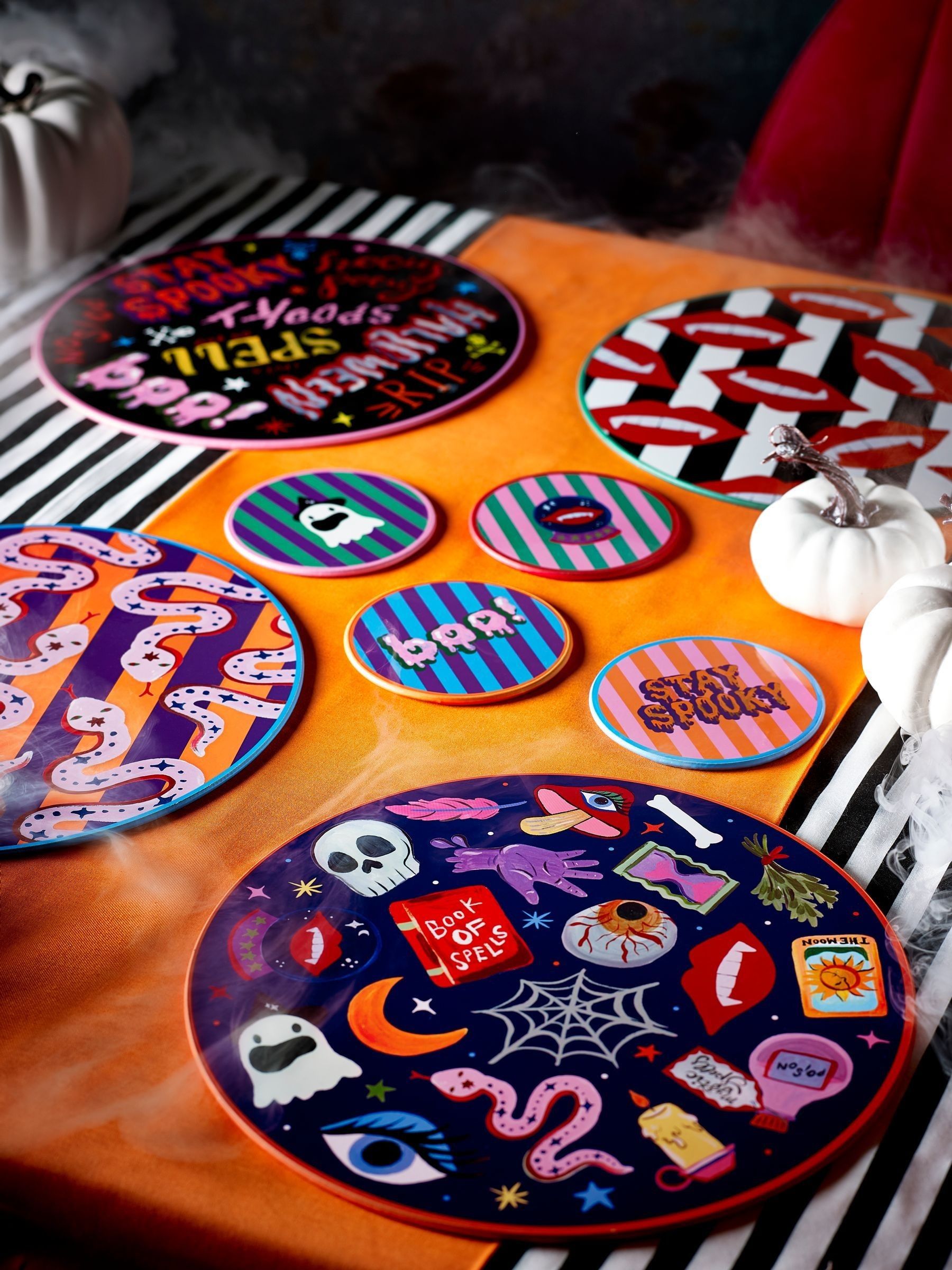 Set the (spooky) table in style with this Eleanor Bowmer Halloween placemat and coaster set! Featuring 4 placemats and 4 coasters, each piece is adorned with Eleanor’s signature hand-illustrated designs — think quirky ghosts, slithering snakes, bold skulls, and fun Halloween slogans like ‘Stay Spooky’. Whether you’re hosting a haunted feast or enjoying pumpkin soup for one, this set promises to keep your table protected and stylish.