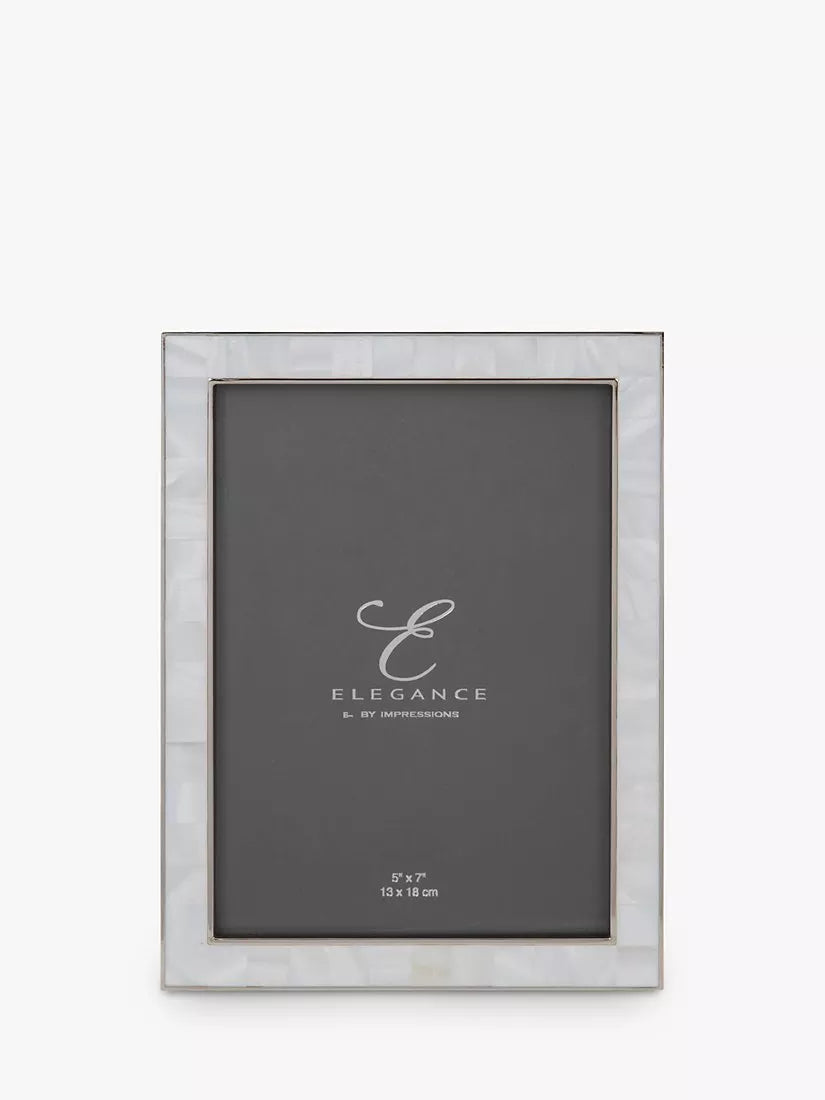 A gift-boxed nickel-plated photo frame with a fine mother-of-pearl inlay, from Elegance by Impressions. The frame can be displayed freestanding, vertically or horizontally, with the black velveteen standing strut. It's presented in a luxury signature Elegance gift box.
