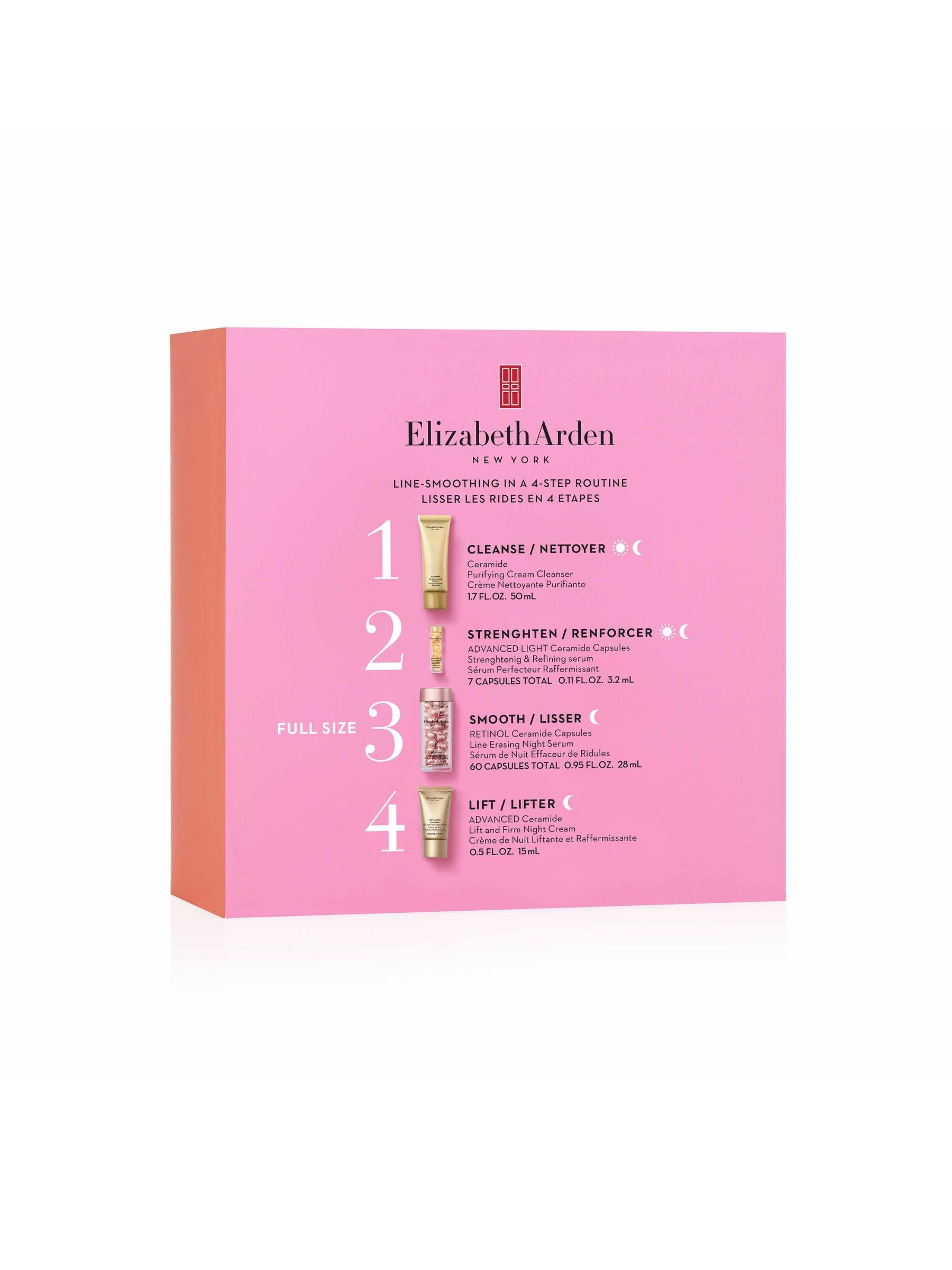Our anti-aging Smooth & Renew 4-piece gift set features our Retinol Ceramide Capsules, which are sealed tight with freshness to deliver the most potent unencapsulated retinol1 to improve texture & tone and refine the look of skin. The set also includes our Advanced Light Ceramide Capsules, which strengthens moisture barrier; Advanced Ceramide Lift and Firm Night Cream to visibly lift and tighten skin and Ceramide Purifying Cream Cleanser, a moisture-enriched cleanser to leave your skin feeling soft, soothed and cleansed. In the evening, use Ceramide Purifying Cream Cleanser as the first step in your skincare regimen. Follow by sweeping onto face and neck Retinol Ceramide Capsules to visibly diminish lines and wrinkles while improving skin texture and tone. Next, Advanced Light Ceramide Capsules to nourish and firm. Finish with Advanced Ceramide Lift and Firm Night Cream to firm, hydrate and tighten skin. Includes regimen instructions for best results. A $146 value. Based on testing of unencapsulated retinol equivalent predictive of 10 months of shelf life. Retinol Ceramide Capsules Line Erasing Night Serum: Our retinol is 76% more potent than unencapsulated retinol. 87% saw visibly reduced lines and wrinkles. 91% agree skin tone looks more even. 94% saw visible improvement in skin’s texture. Moisturizes skin; non-drying formula 1 based on testing of unencapsulated retinol equivalent predictive of 10 months of shelf life. Advanced Ceramide Lift and Firm Night Cream: 5X the ceramides. Features 3D Fit Technology with Ceramides, Tetrapeptides and Edelweiss Extract3 to firm, intensely hydrate and tighten skin. 96% saw younger-looking skin4. 95% saw tighter, firmer skin. 93% saw more defined facial contours Based on reformulation vs. existing Lift and Firm Creams. From cell cultures. Based on a consumer study of 56 women after 8 weeks. # ADVANCED LIGHT Ceramide Capsules Strengthening & Refining Serum. Barrier-strengthening & pore-perfector improves skin texture and tone. Restores balance for a radiant complexion with enhanced clarity. Ultra-light serum minimizes look of pores Ceramide Purifying Cream Cleanser: Creamy, moisture-enriched cleansing lotion quickly and gently dissolves makeup and impurities. Leaves skin feeling clean and soft.