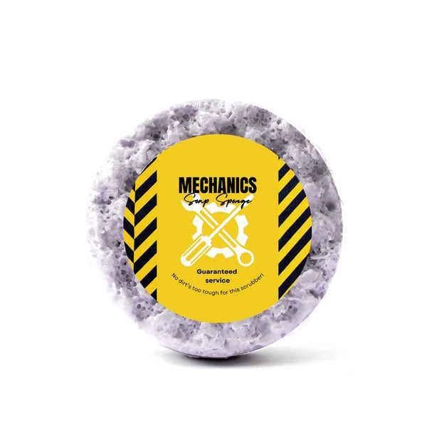 The The Mechanic One Soap Sponge features a bold Like A Boss scent with oak, cedar, mandarin, musk, and amber, plus a nourishing triple butter formula—perfect for hardworking hands.