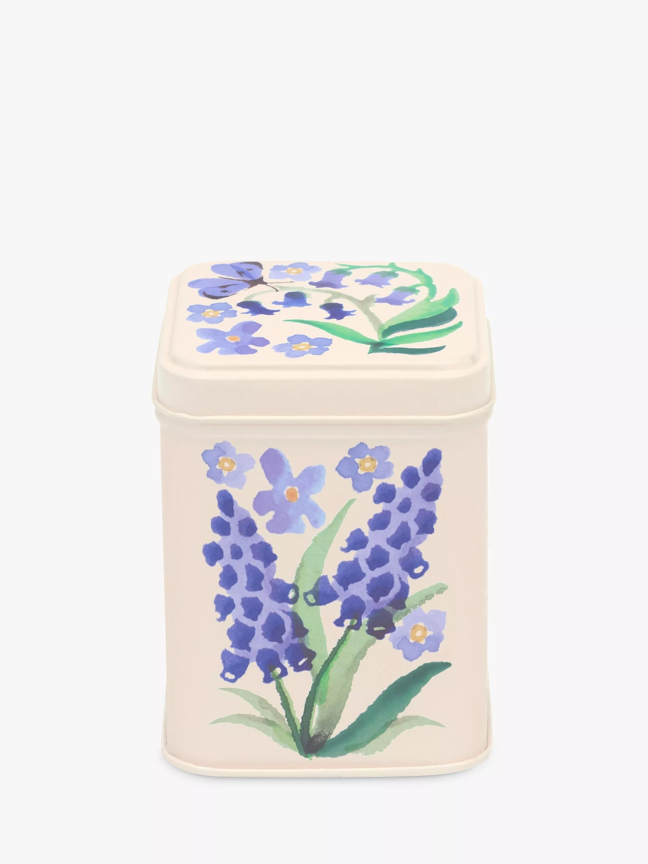 Square caddy and lid decorated with different wildflower prints from Emma Bridgewater, signalling spring in full swing. An ideal kitchen storage tin for tea, coffee or sugar.