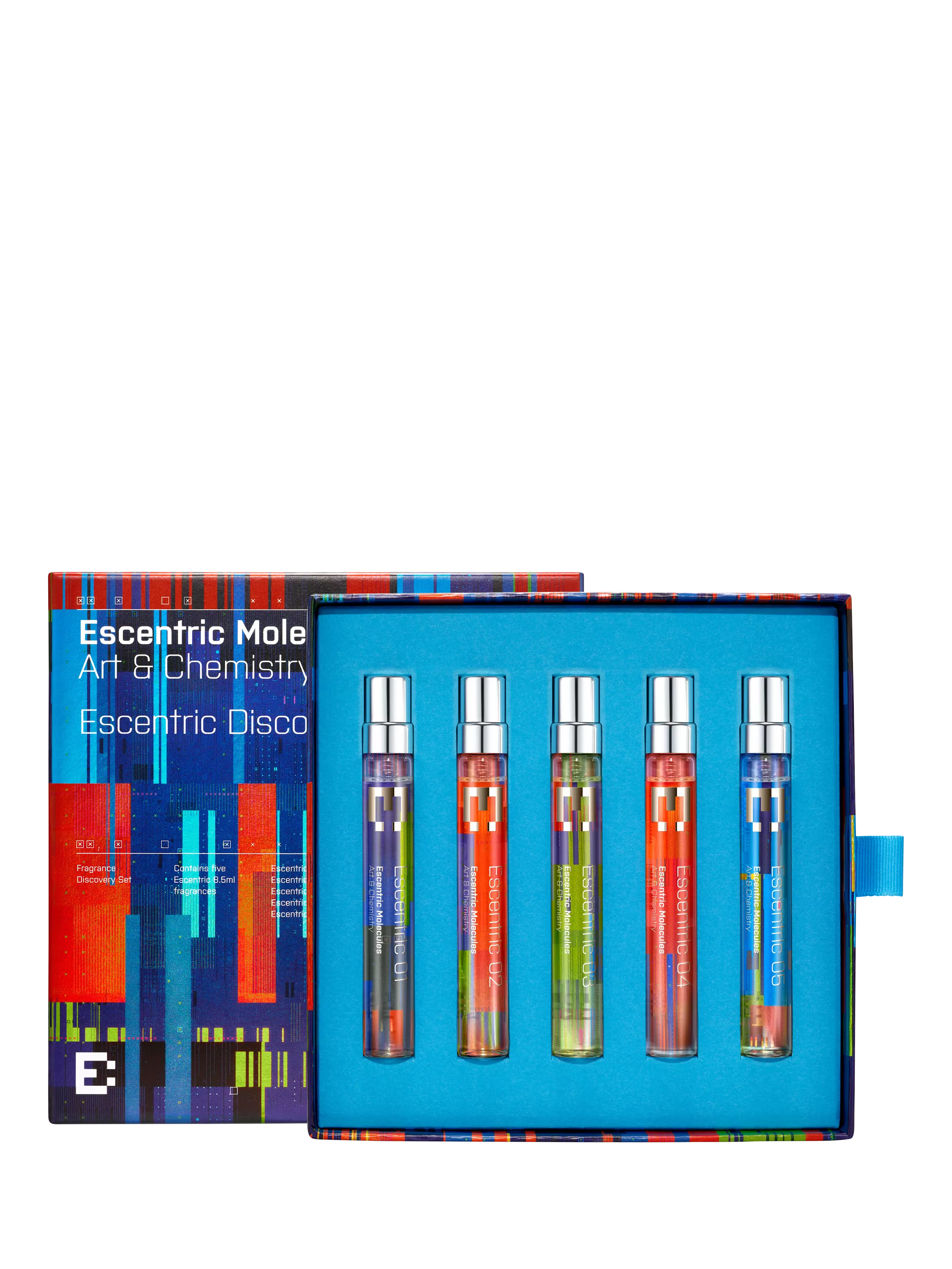 Discover Escentric Molecules' Art & Chemistry Escentric Discovery Fragrance Gift Set – a curated collection of five unique fragrances, perfect for exploring your personal scent profile. This set allows you to experience the brand's innovative approach to fragrance, highlighting the key facets of each aroma-molecule. Each 8.5ml bottle is ideal for travel or evenings out.