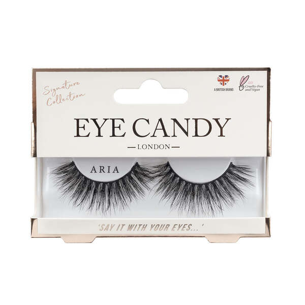 The Eye Candy Aria lashes are a dramatic addition to the brand's Signature Collection. These meticulously designed lashes offer intense dimension suitable for making a visual impact. They are crafted to deliver noticeable volume and significant length for an eye-catching look.