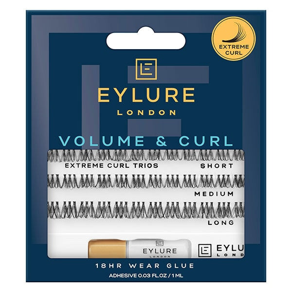 bring the salon home with our volume curl trio cluster lashes these perfect c curl lashes will have you feeling like you just left the salon our extreme curl flares allow you to fully customize and create your bespoke look over and over again handmade and reusable every lash pack also comes with our latex free lash glue that is guaranteed to last up to 18 hours