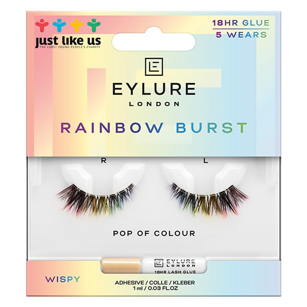 Introduce a playful pop of colour to your makeup routine with these Eylure Rainbow Burst lashes. These distinctive lashes are handmade, featuring vibrant, rainbow-tipped ends for a truly bold finish. They offer a unique way to express yourself while supporting an inclusive charity partnership.