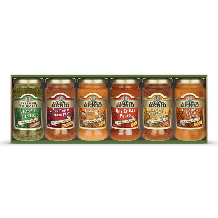 Each of the Filippo Berio Pesto Pack sauces are made to traditional Italian recipes and packed full of rich flavours as we only use the finest ingredients. For example, our Classic green pesto includes 36% Ligurian Basil and our Sun Dried Tomato Pesto includes 40% Sun Dried Tomatoes! This pack contains 6 of our best selling pesto sauces brought to you in a convenient and great value collection. Each jar is produced in Liguria in the North of Italy, the home of traditional pesto. It is also close to the original home of Filippo Berio, the man behind our famous and market leading range of olive oils, balsamic vinegars and pesto sauces.