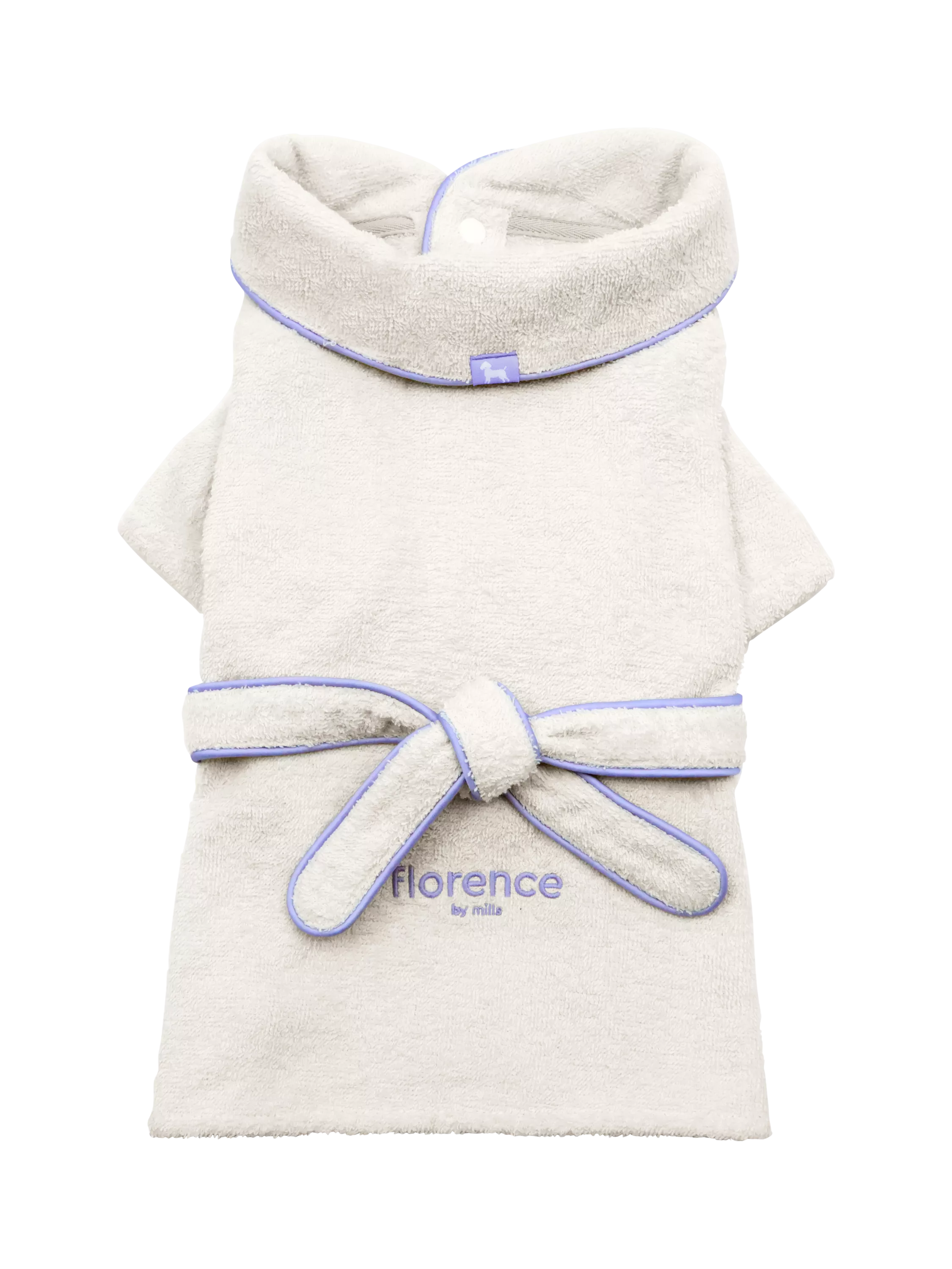 This premium dog bathrobe is made from 100% recycled cotton terry fabric, ensuring your furry friend stays cosy and comfortable. The solid color with contrast color binding creates a sleek and stylish look, while the ""winnie"" logo tab adds a touch of playfulness. The snap button closure and tied waist make it easy to put on and take off, and the logo embroidered at the bottom adds a touch of sophistication.