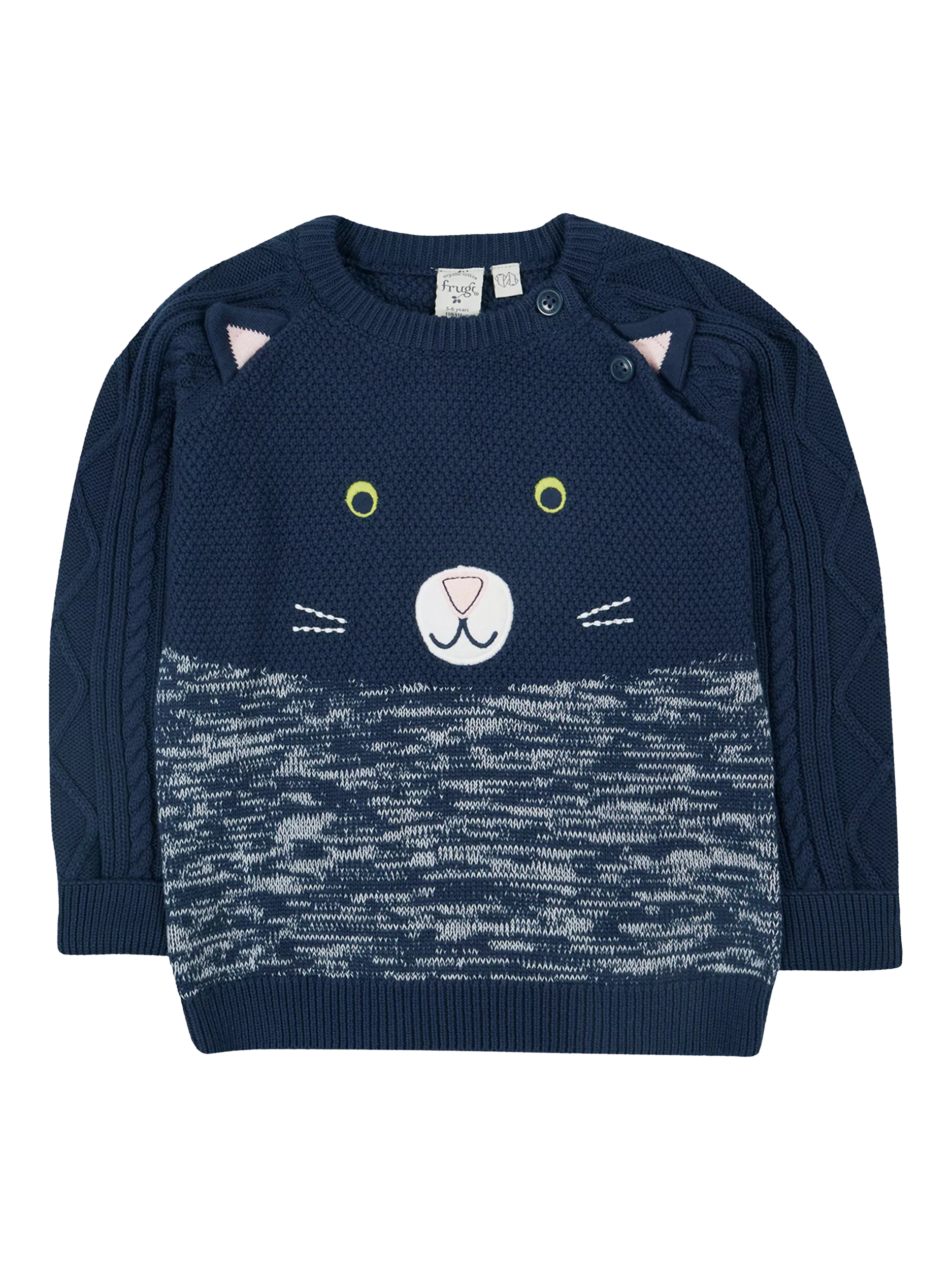 Find a unique balance with this kids' cable knit jumper by Frugi. Combining a charming cat character design with classic details, this jumper is stylish, easy to wear and made from organic cotton.