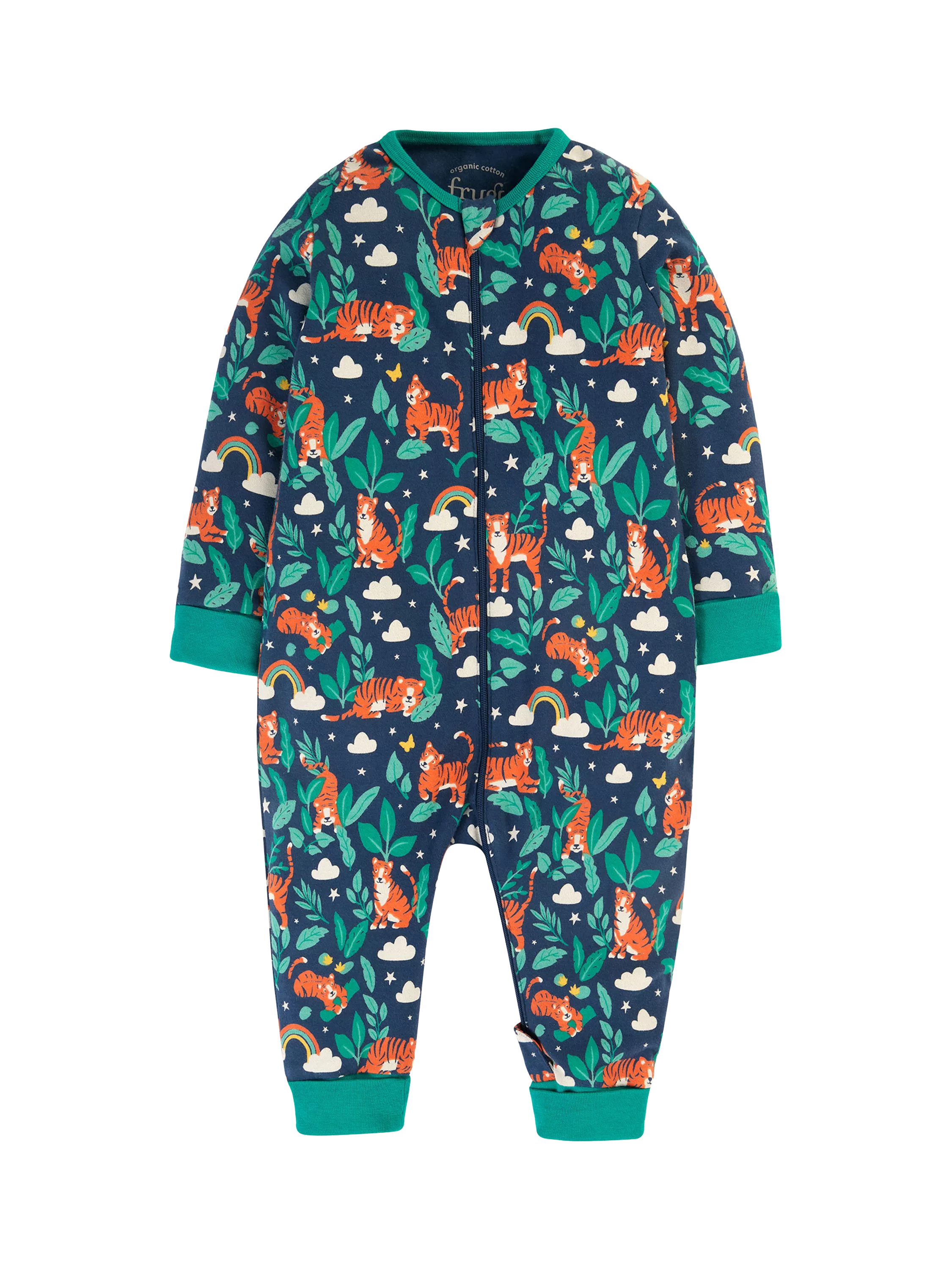 Covered in an exotic tiger and rainbow print, this onesie is made from organic cotton with an interlock zip front completed with a zip garage to protect delicate skin.