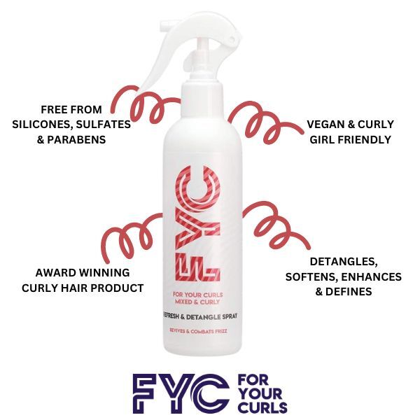 250ml fyc refresh detangle spray revives and combats frizz an award winning refresh and detangling spray designed to revitalise detangle and control frizz key ingredients shea butter organic aloe vera argan oil and pro vitamin b5 to prevent tangling and add moisture and shine fyc refresh detangle spray removes frizz and defines your natural curls leaving your hair feeling soft and revitalised detangles and softens hair enhances and defines curls controls frizz repairs damage 250ml fyc leave in conditioner tame frizz and control curls an awardwinning lotion specifically formulated to moisturise and define curls key ingredients shea butter olive oil pro vitamin b5 and organic aloe vera to hydrate define and add shine to your curls fyc leavein conditioner removes frizz and defines hair to reveal healthy natural curls leaving your hair feeling moisturised and silky conditions and locks in moisture defines curls removes frizz protects hair adds shine and bounce