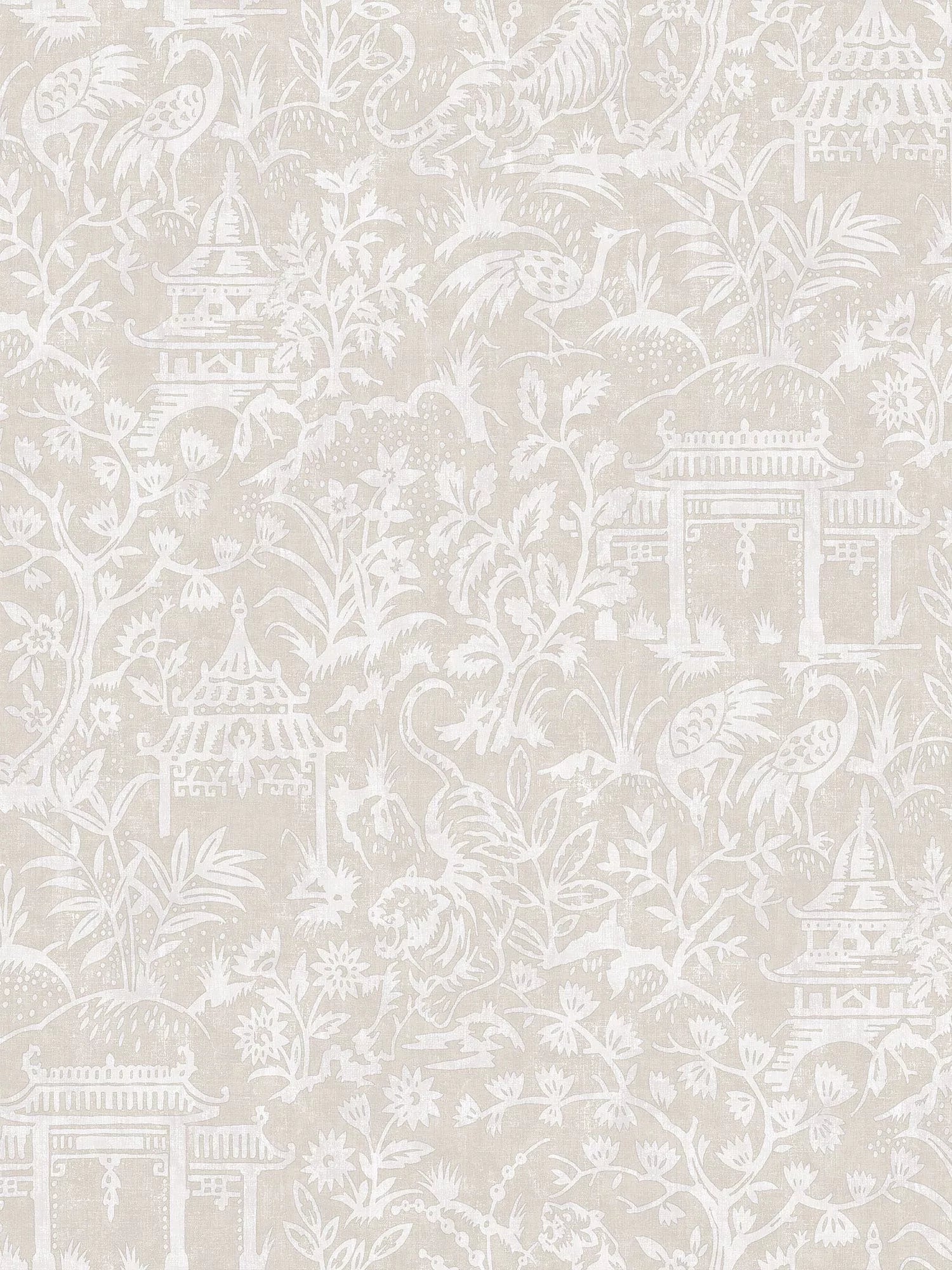 A fantastical wallpaper that reflects the 1970s fashion for exotic patterns and global cultures. Representative of a garden in the Far East, this oasis scene of floral sprigs, stylised trees, tigers and birds has been designed in a woodblock style effect to give it a time-worn look.