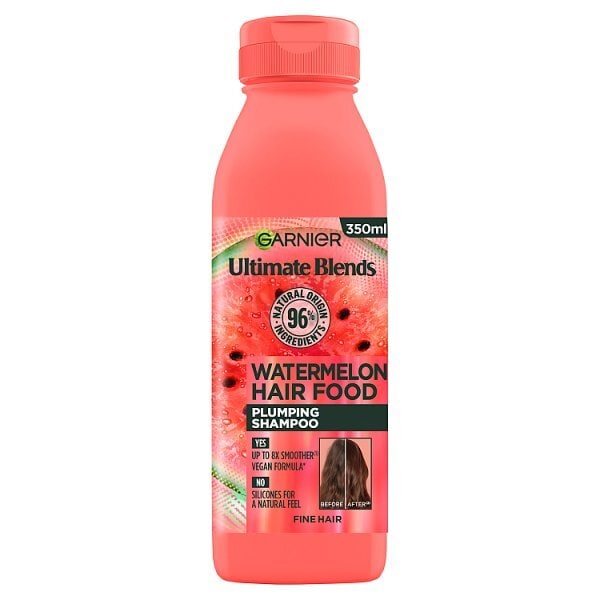garnier ultimate blends hair food watermelon shampoo cleanses plumps fine hairits light foam gently cleanses boosts hair with no weigh downyes 96 natural ingredients blended with watermelon pomegranateyes vegan formula no animal ingredients or byproductsyes recyclable bottle bottles are 100 recyclable and made with 50 recycled plasticno silicones for a natural feel