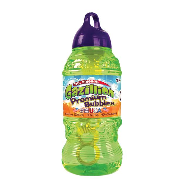 This Gazillion super solution is formulated to produce the biggest and brightest bubbles possible for extended outdoor fun. This 2-liter bottle provides ample liquid for many sessions of play. The included wand attaches directly to the cap for convenient storage and use.