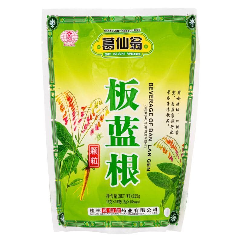 Ge Xian Weng Ban Lan Gen Instant Herbal Tea is a Chinese herbal tea that features Ban Lan Gen, which is the Chinese term for Isatis indigotica root. This herbal tea is often used to support the respiratory system and promote overall well-being. Ban Lan Gen is known for its potential to clear heat and toxins from the body, and it is commonly used in traditional Chinese medicine during times of discomfort associated with heat or damp-heat conditions.