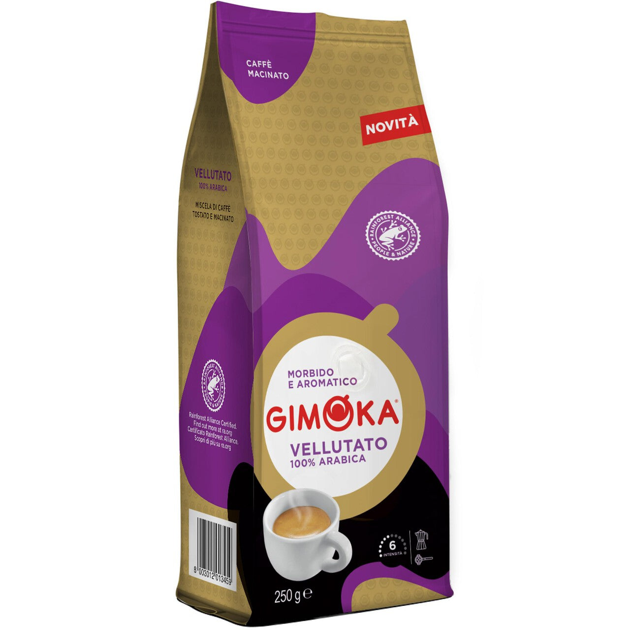 Gimoka Vellutato presents a distinctly smooth, velvety coffee experience built upon 100% Arabica sourcing. This finely roasted and ground selection carries the respected Rain Forest certification. It is balanced for regular consumption with a moderate intensity level.