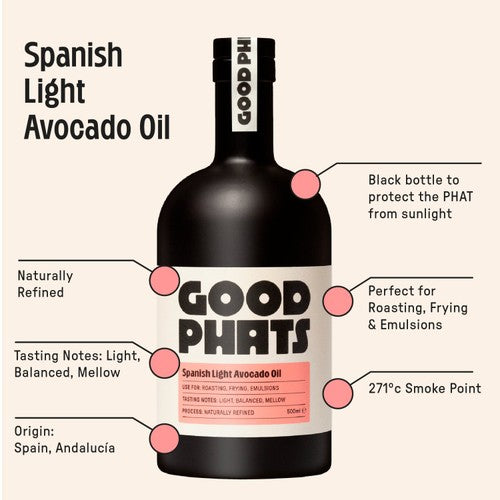 GOOD PHATS Light Avocado Oil is sourced from Spain and functions as an ultimate everyday cooking oil. This versatile oil features a light and neutral taste, making it an excellent substitute for standard seed oils in various recipes.